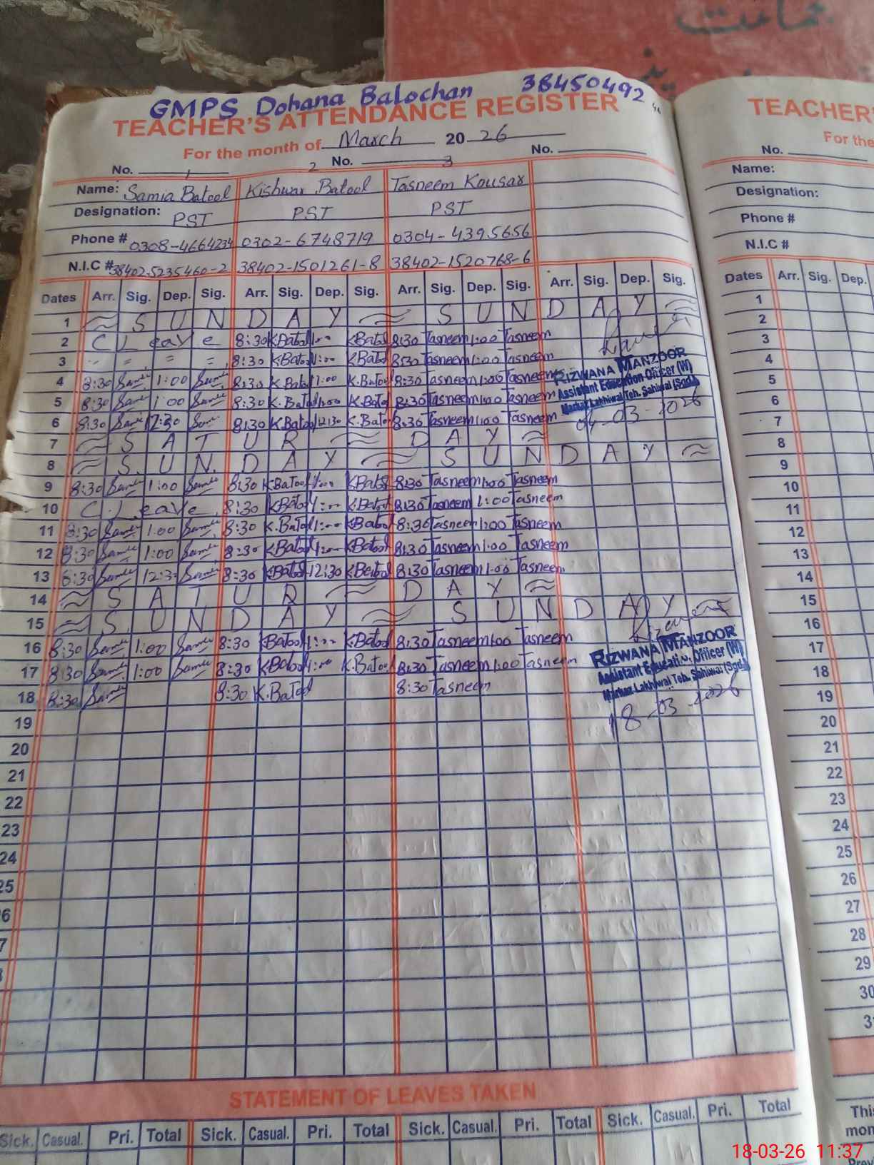 | Name: SA**** BA**** Designation: (School Headmaster's/Headmistress's) PST Phone/Cell Number: 03**** |