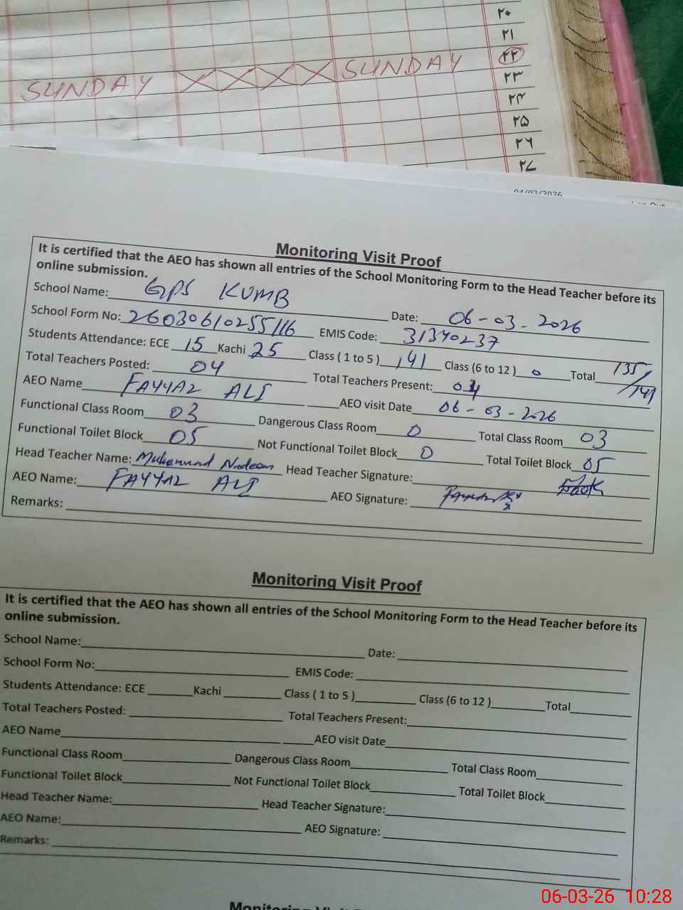 | Monitoring Date: 06-03-2026 | Start Time: 06-03-2026 10:10 AM | End Time: 06-03-2026 10:28 AM | Name of MEA: Fa**** Al**** | |