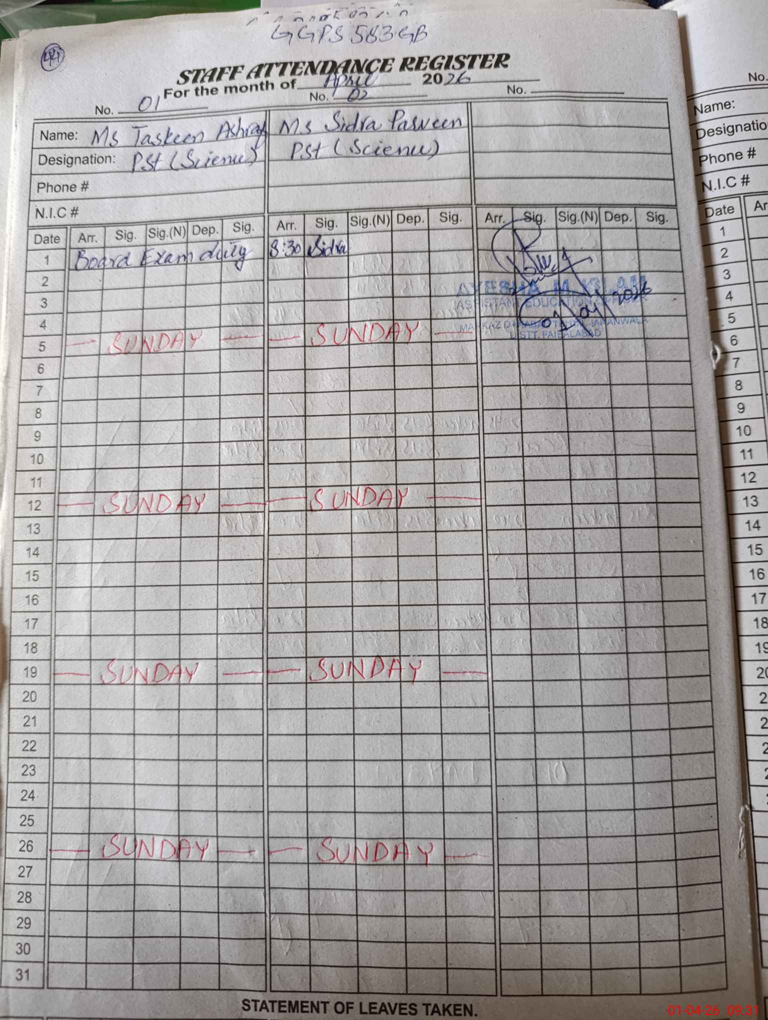 | 33**** | Ta**** As**** | PST Science/Maths | Regular | 0 | 0 | 0 | 0 | 0 | 0 | 0 | 0 | 0 | Exam Duty |