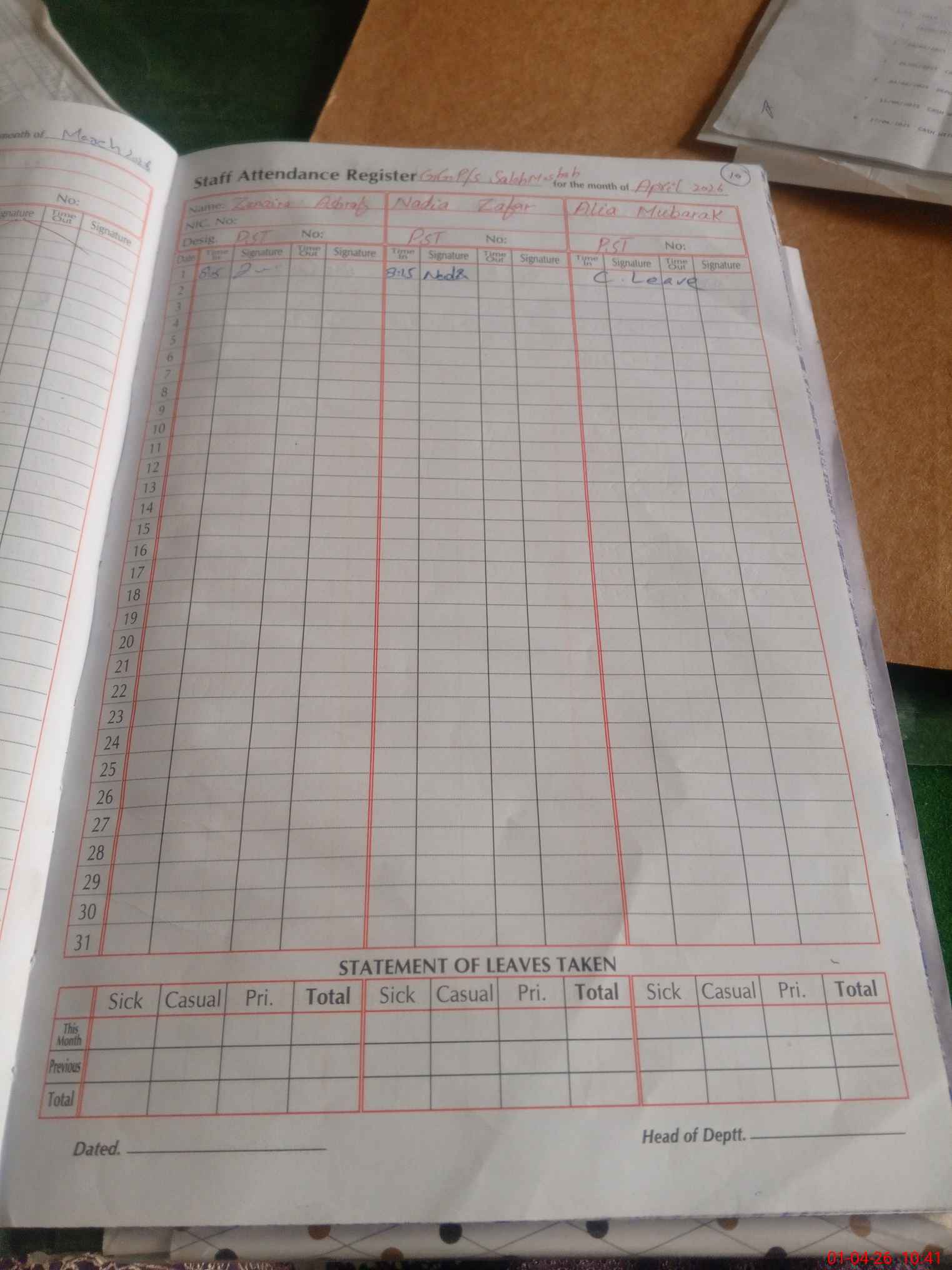 | Leave | Duty | Absent | Maternity | Medical | Ex- Pak |