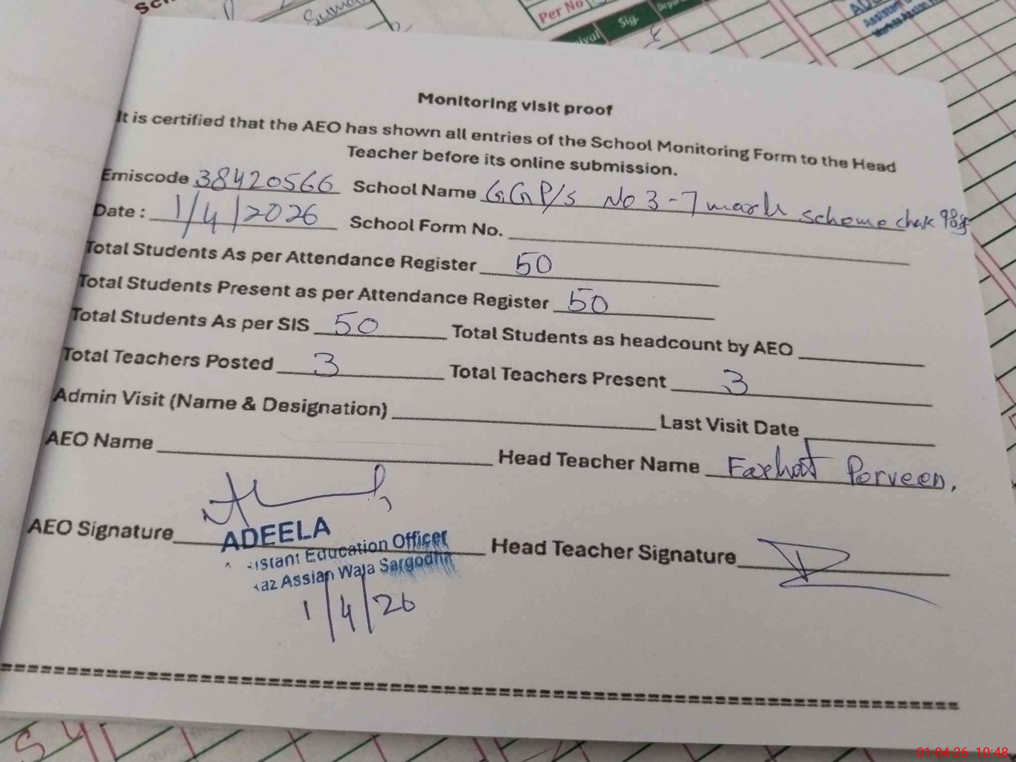 | Attendance Register | Head Teacher | MEA with School | Visit Proof |