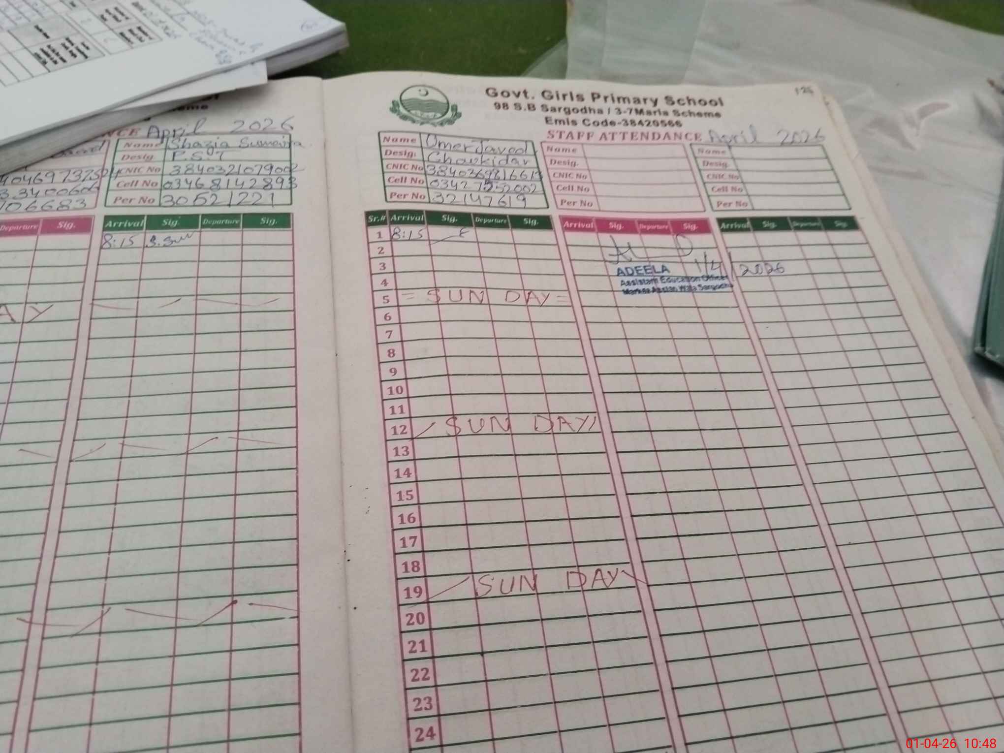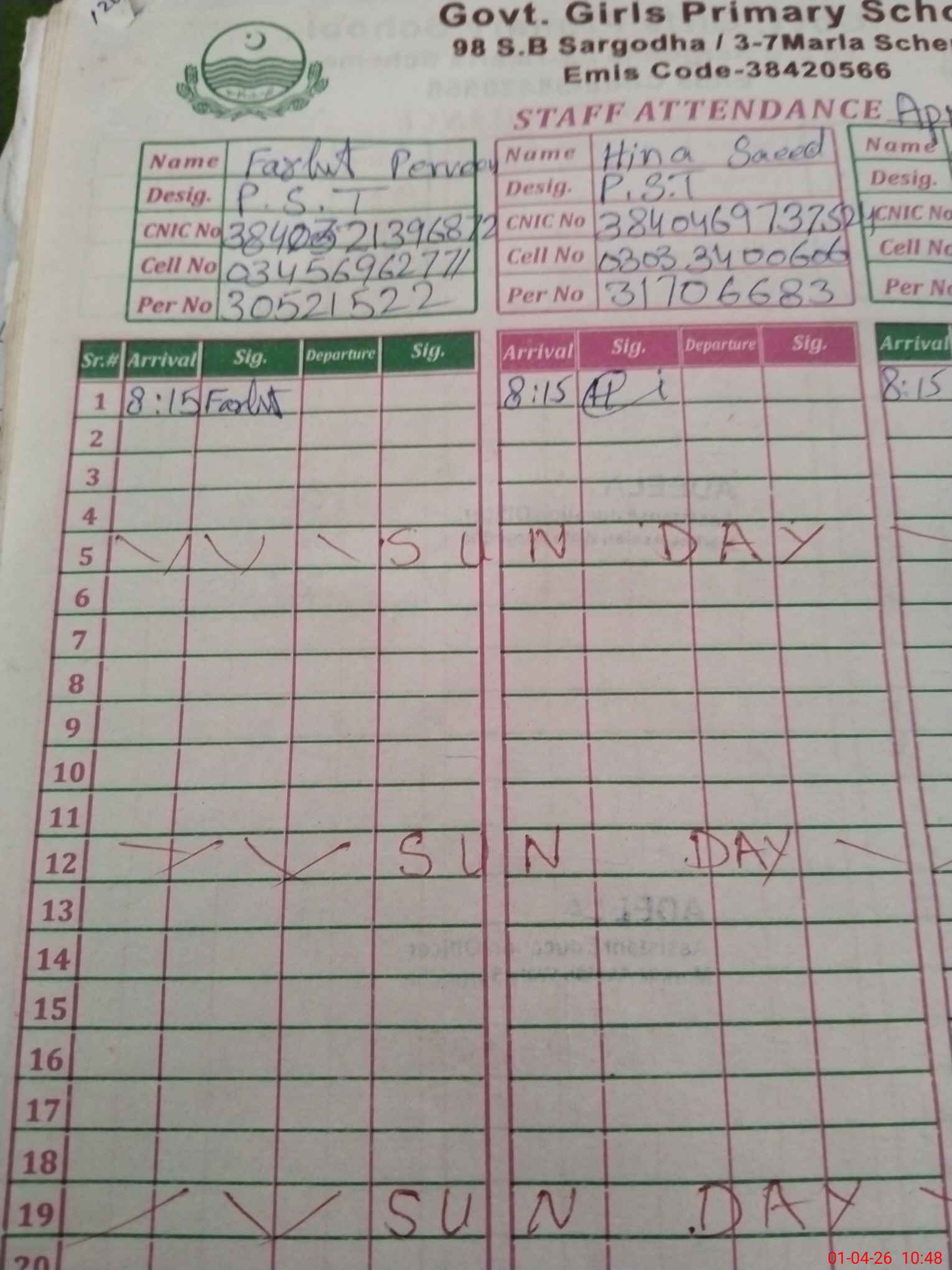 | CNIC | Full Name | Designation | R/C | Absence During Last Calender Month |