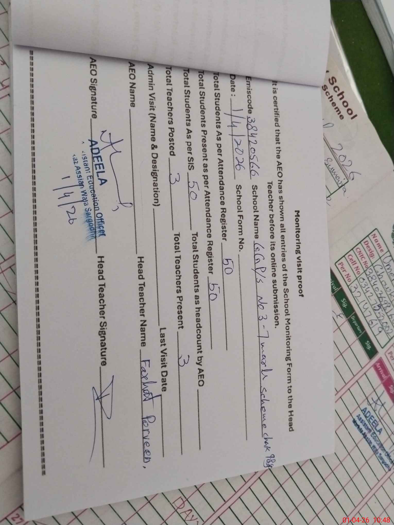 | Name: FA**** PA**** Designation: (School Headmaster's/Headmistress's) PTC/JV Phone/Cell Number: 03**** |