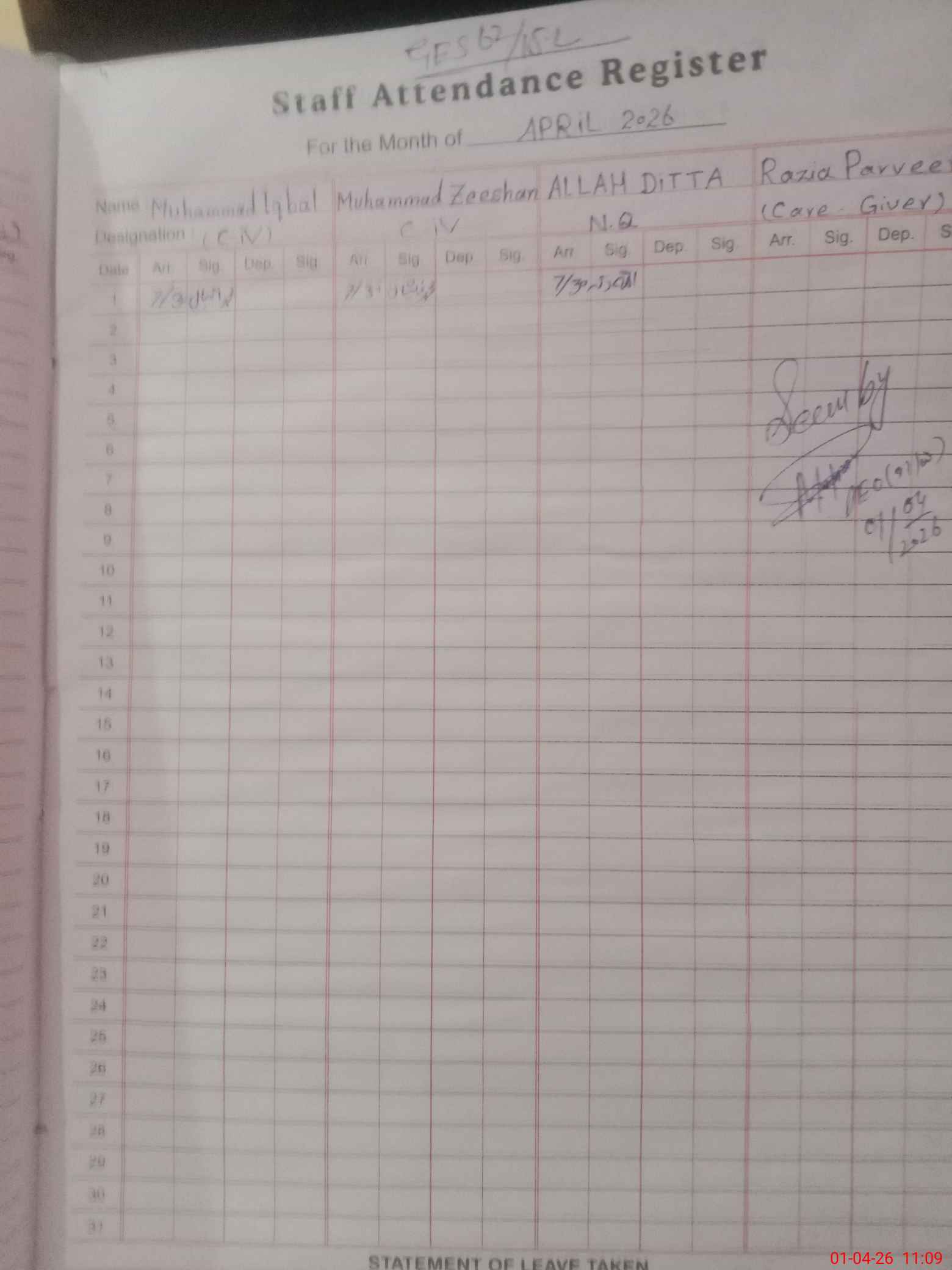 | CNIC | Full Name | Designation | R/C | Absence During Last Calender Month |