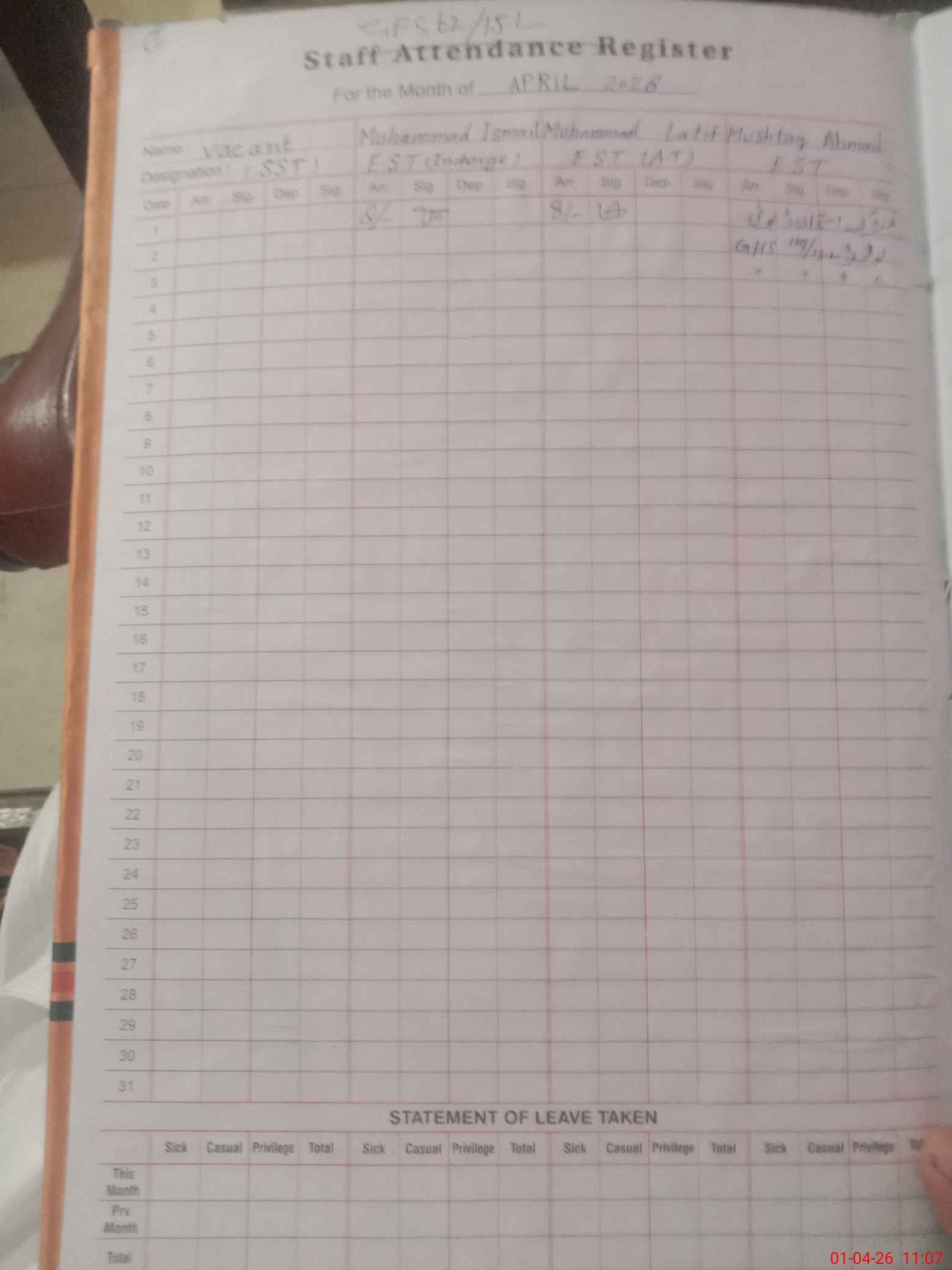 | Monitoring Date: 01-04-2026 | Start Time: 01-04-2026 10:54 AM | End Time: 01-04-2026 11:09 AM | Name of MEA: Mu**** Ra**** | |