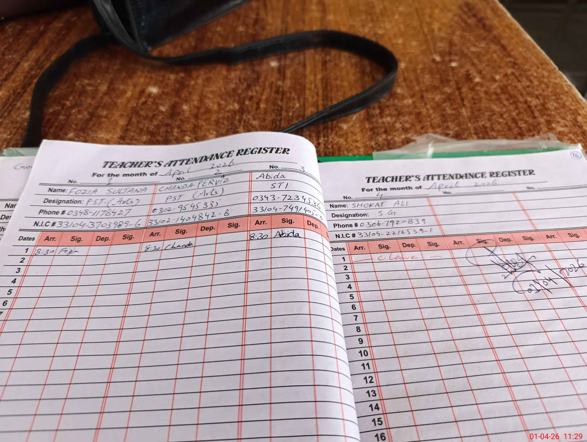 | CNIC | Full Name | Designation | R/C | Absence During Last Calender Month |