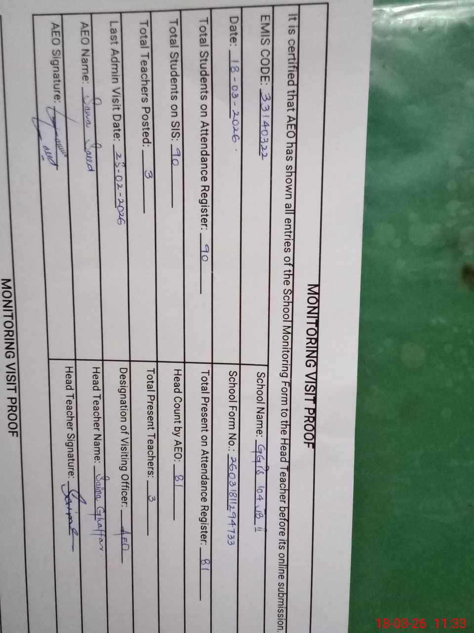 | Attendance Register | Head Teacher | MEA with School | Visit Proof |