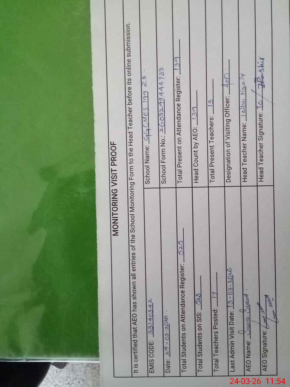 | Attendance Register | Head Teacher | MEA with School | Visit Proof |