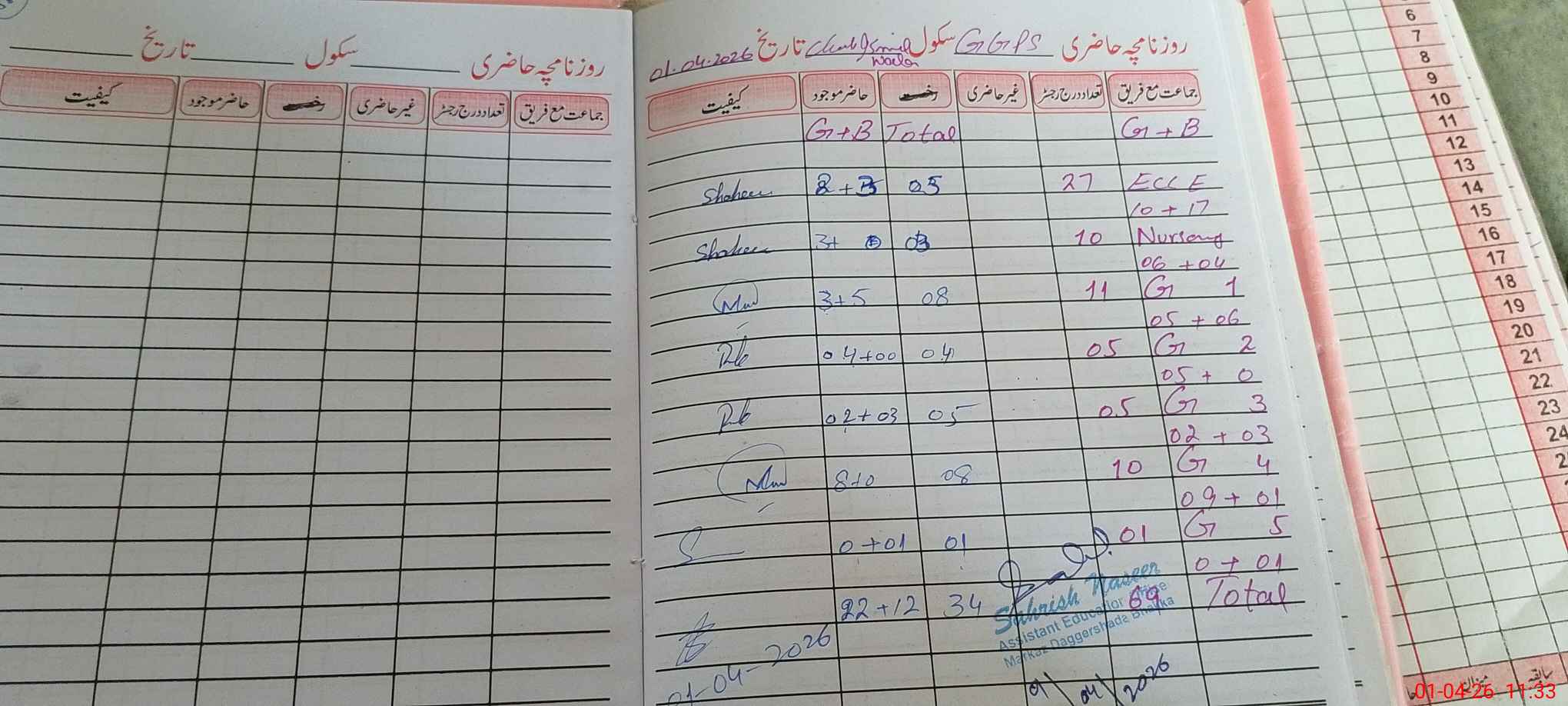 | No. of Students Present - Female | 0 | 2 | 3 | 4 | 2 | 8 | 0 | 22 | ||||||||
