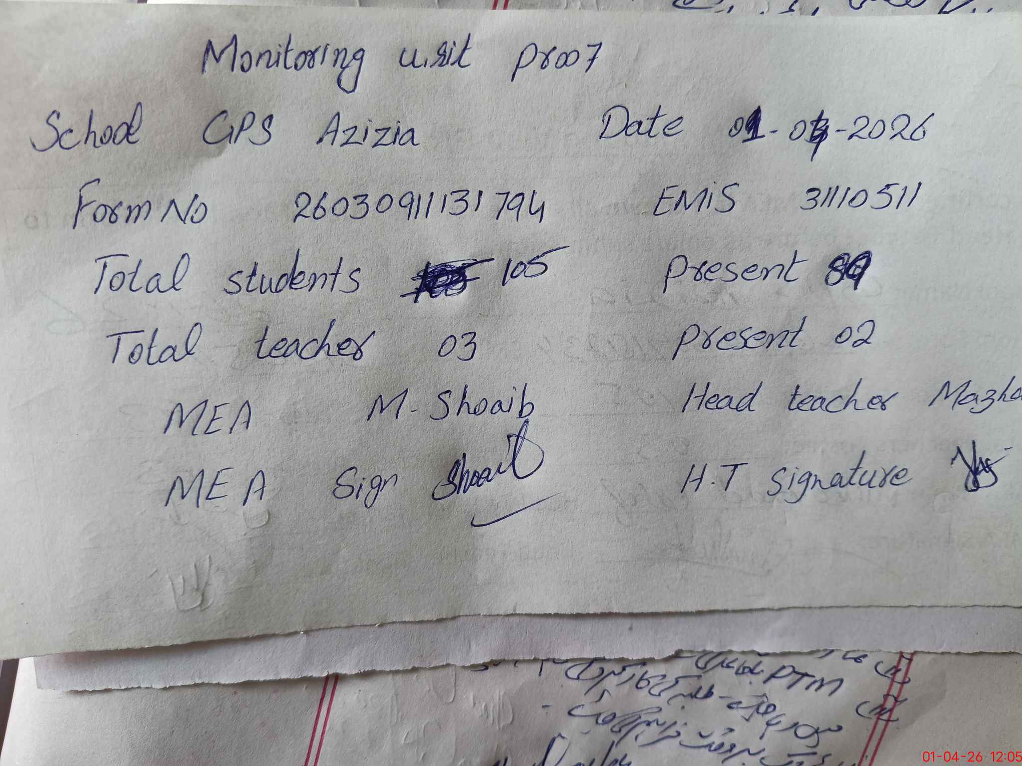 | Monitoring Date: 01-04-2026 | Start Time: 01-04-2026 11:18 AM | End Time: 01-04-2026 12:05 PM | Name of MEA: MU**** SH**** | |