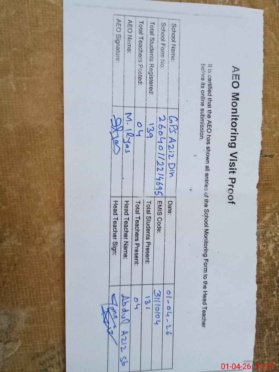 | EMIS Code: 31110104 | Name of School: GPS AZIZ DIN | |||