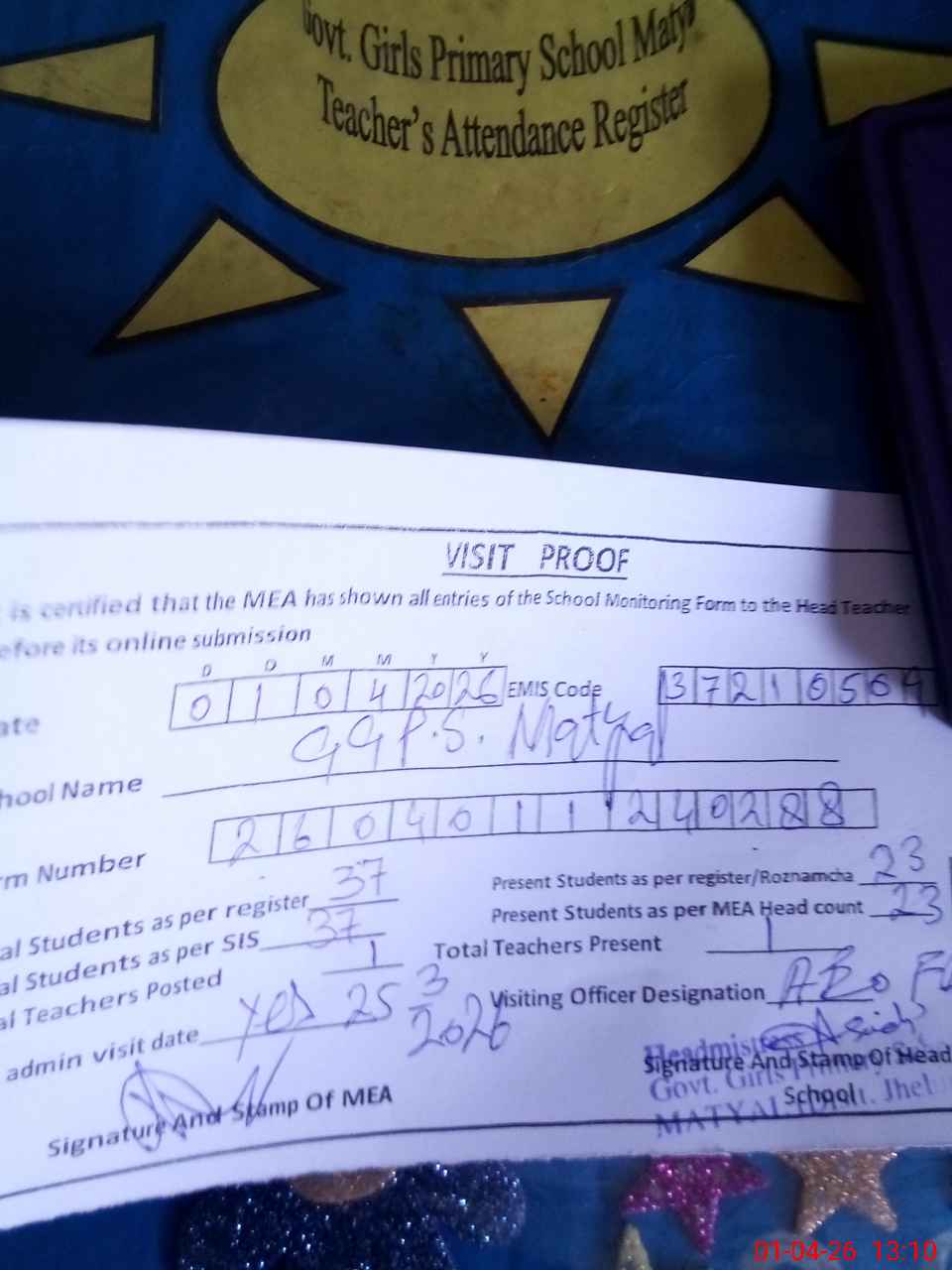 | Attendance Register | Head Teacher | MEA with School | Visit Proof |