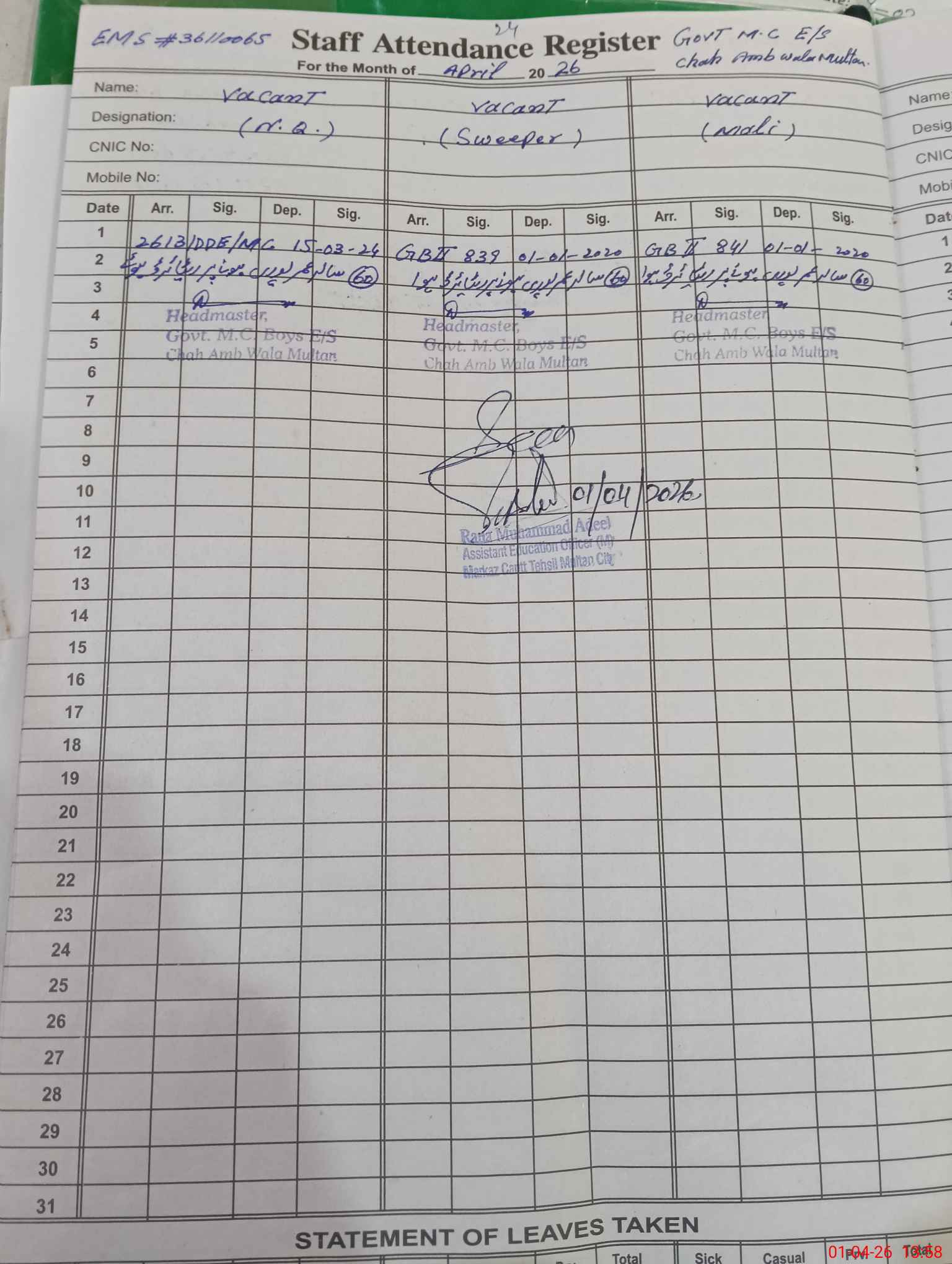 | EMIS Code: 36110065 | Name of School: GES MC CHAH AMBB WALA MULTAN | |||