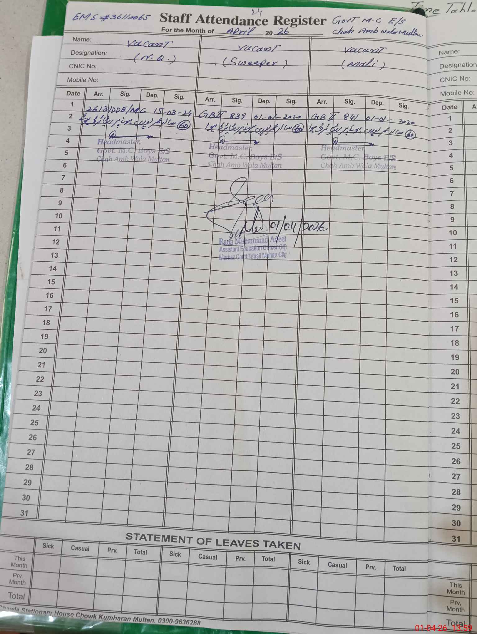| 36**** | Ta**** Iq**** | EST Science | Regular | 0 | 0 | 0 | 0 | 0 | 0 | 0 | 0 | 0 | Exam Duty |