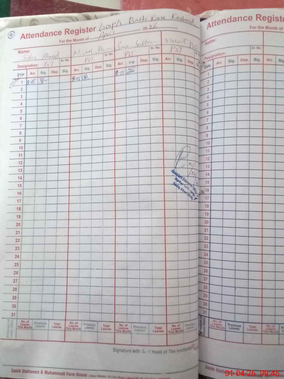 | CNIC | Full Name | Designation | R/C | Absence During Last Calender Month |