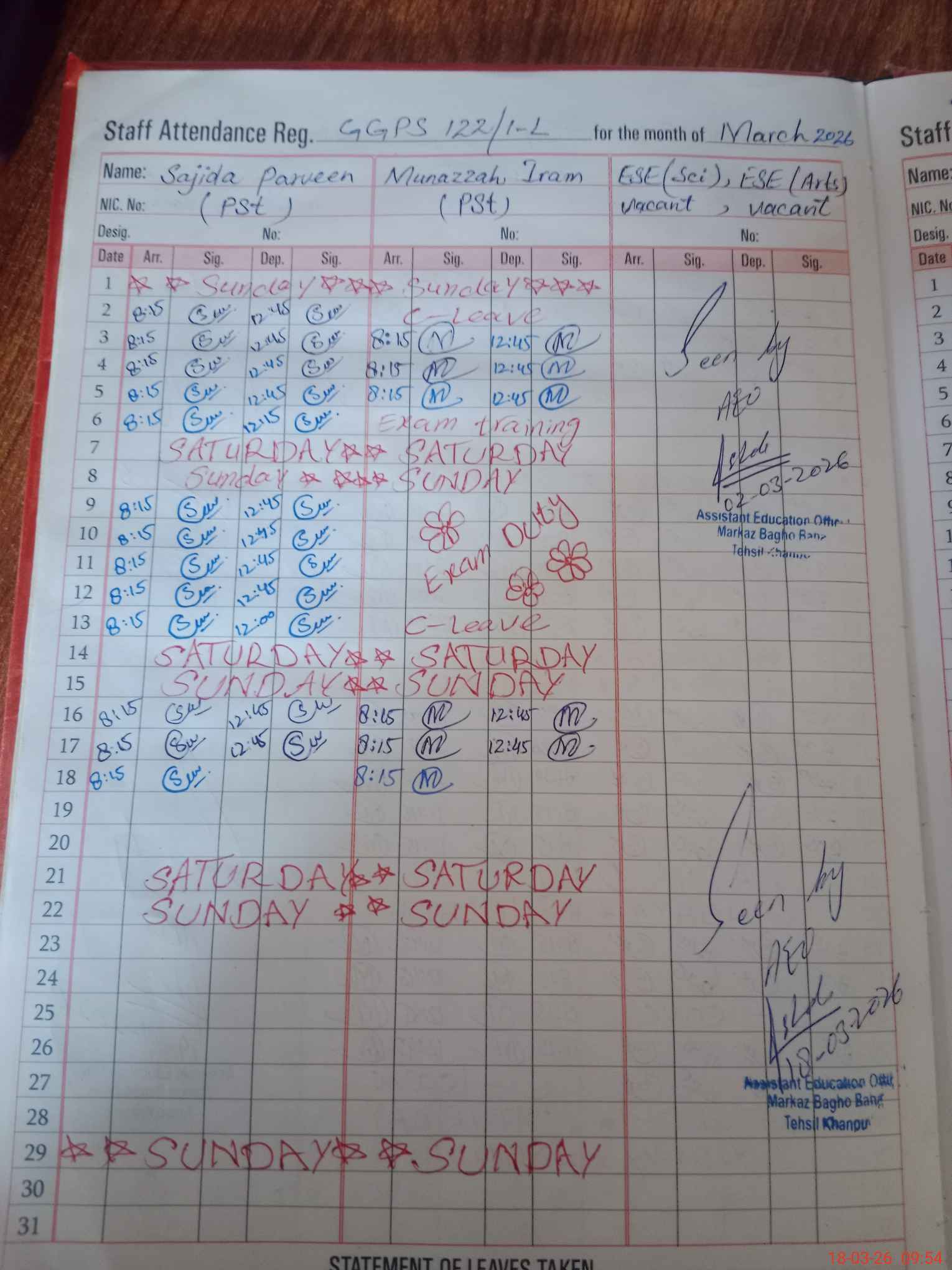 | Leave | Duty | Absent | Maternity | Medical | Ex- Pak |