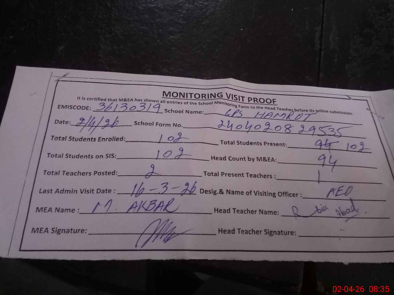 | EMIS Code: 36130319 | Name of School: GPS HAMROOT MULTAN | |||