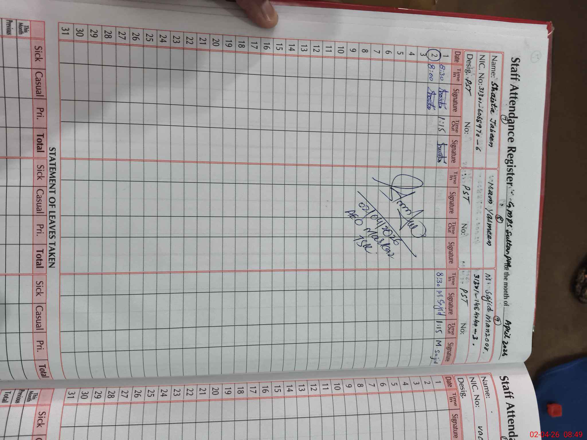 | Name: Ai**** Sa**** Designation: (School Headmaster's/Headmistress's) P S T Phone/Cell Number: 03**** |