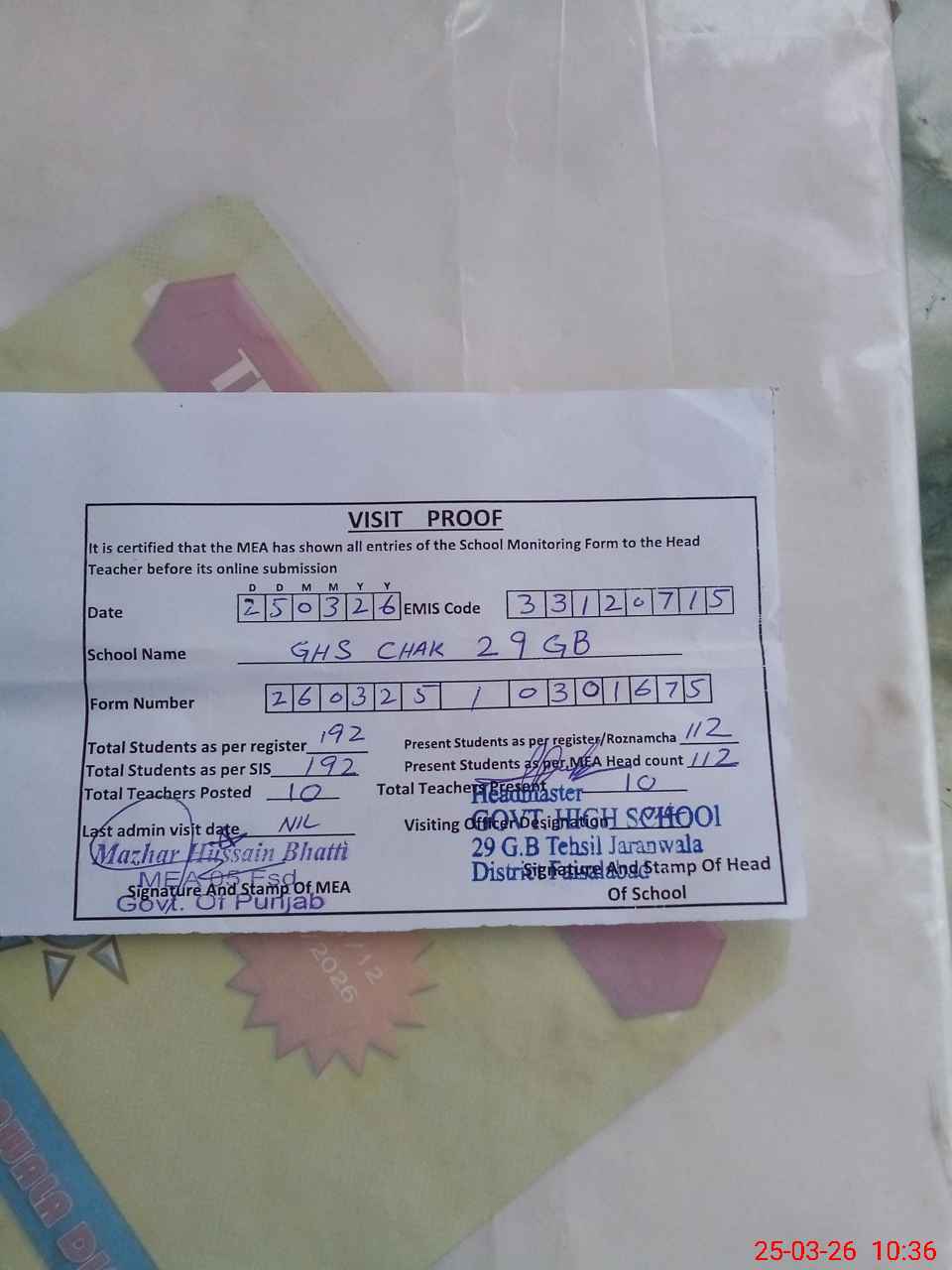 | Attendance Register | Head Teacher | MEA with School | Visit Proof |