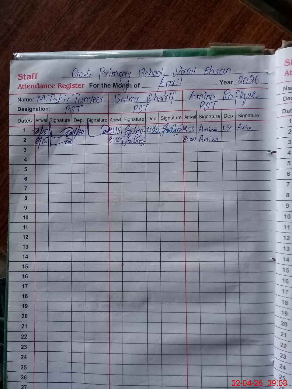 | CNIC | Full Name | Designation | R/C | Absence During Last Calender Month |