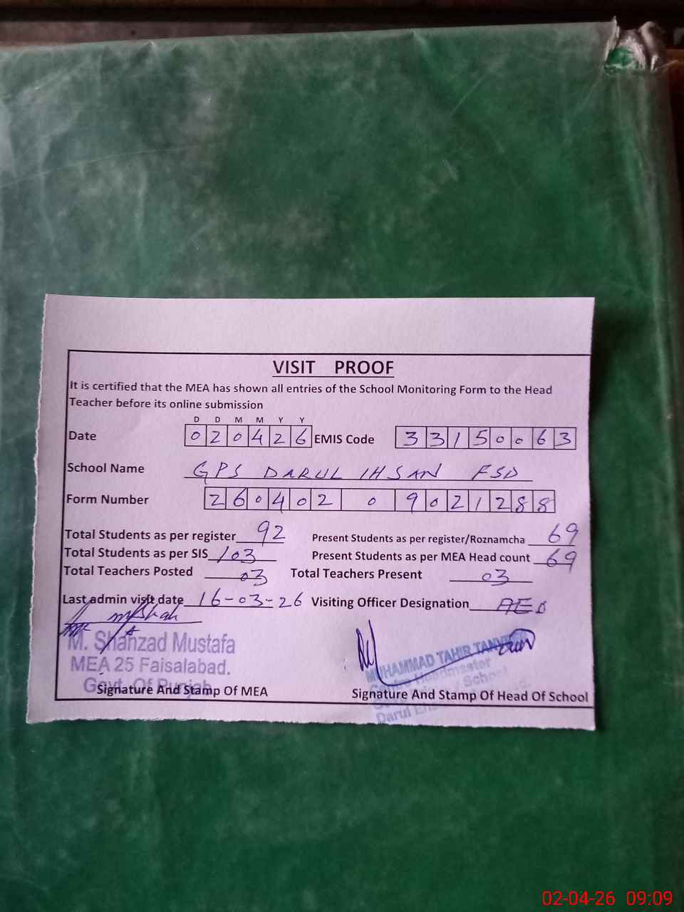 | Attendance Register | Head Teacher | MEA with School | Visit Proof |