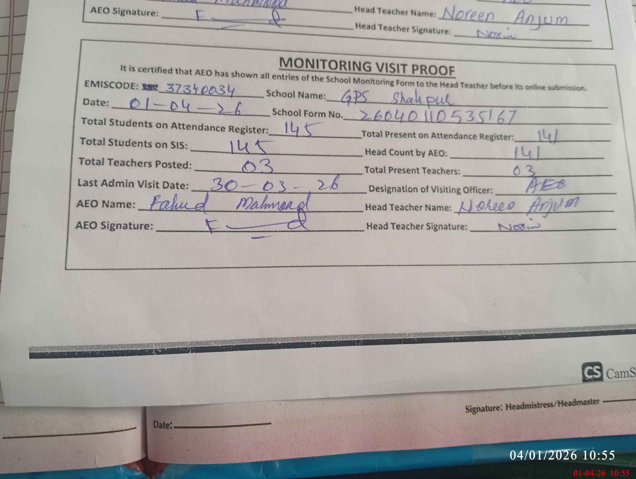 | Attendance Register | Head Teacher | MEA with School | Visit Proof |