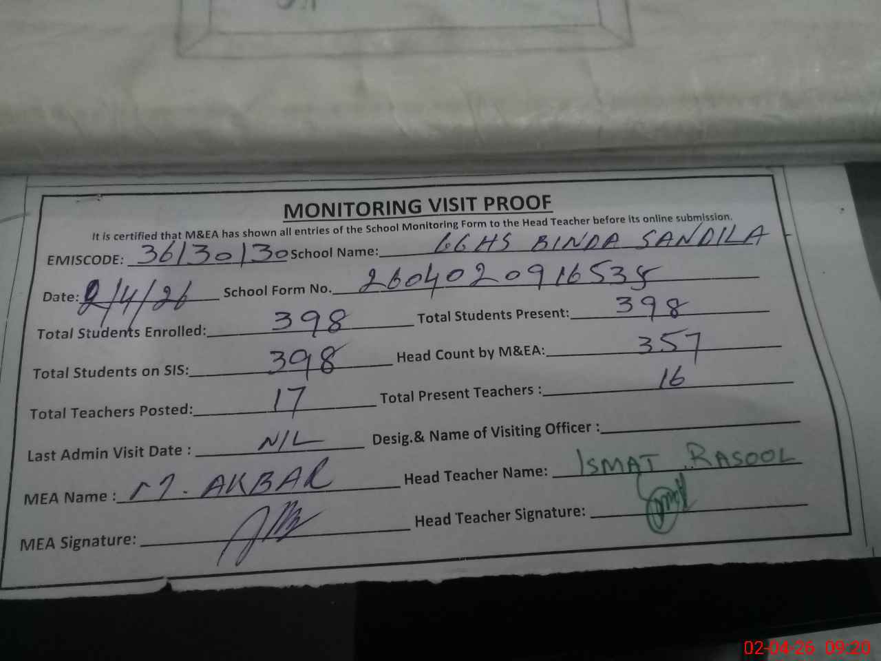 | Attendance Register | Head Teacher | MEA with School | Visit Proof |