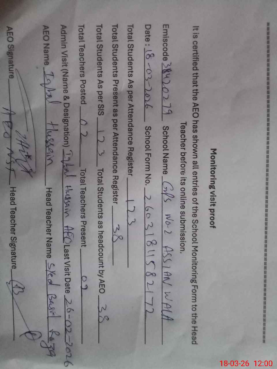 | Attendance Register | Head Teacher | MEA with School | Visit Proof |