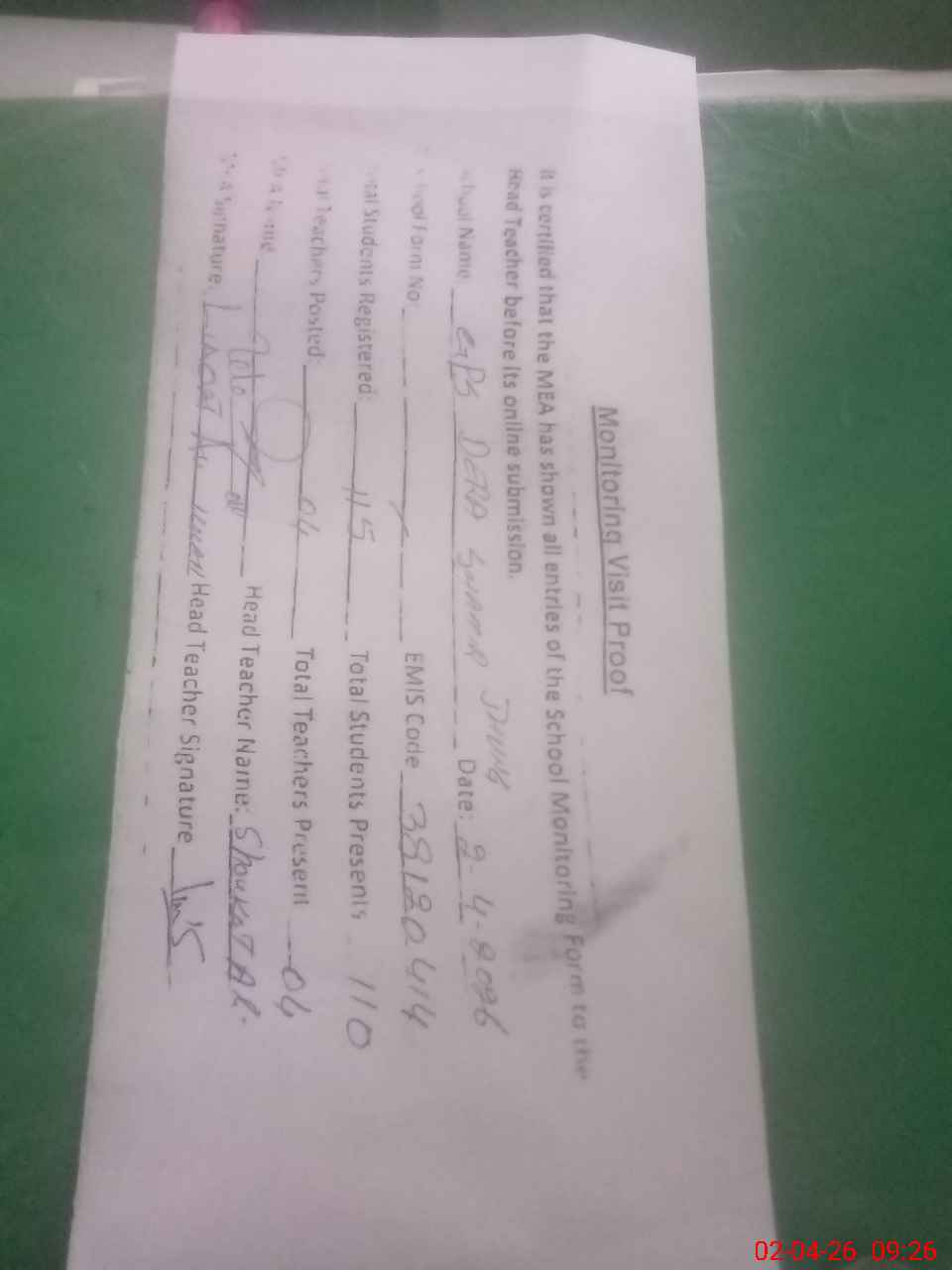 | EMIS Code: 38120414 | Name of School: GPS DERA SHAMIR JHUNJ | |||