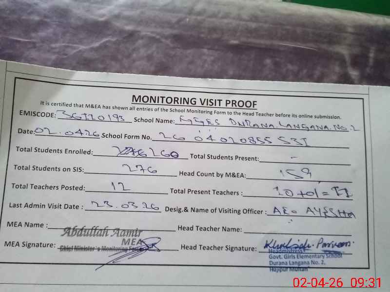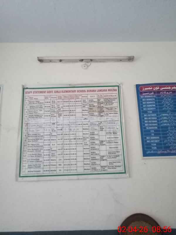 | EMIS Code: 36110193 | Name of School: GGES DURANA LANGANA NO.2 HAJI PUR MULTAN | |||