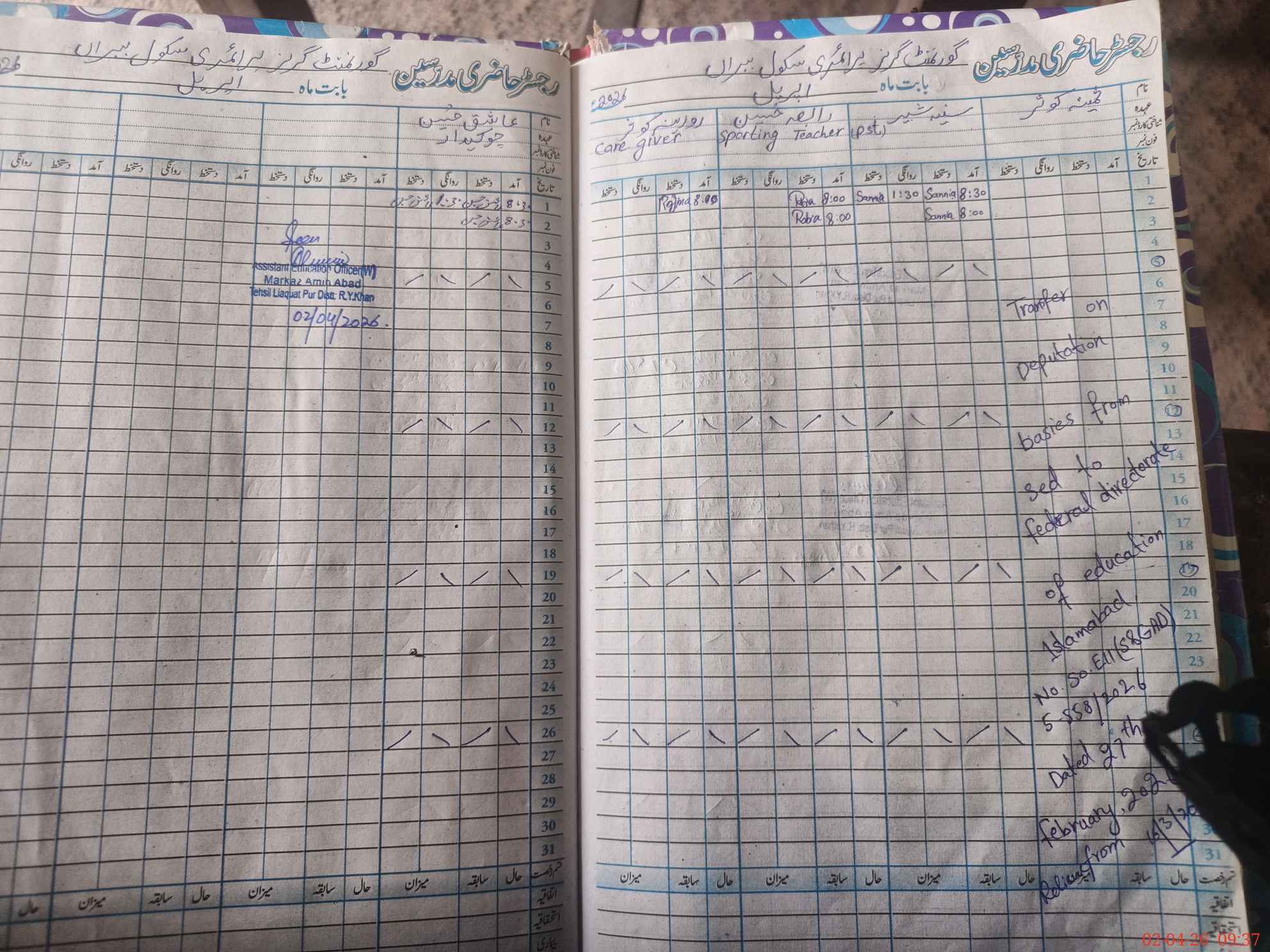 | CNIC | Full Name | Designation | R/C | Absence During Last Calender Month |