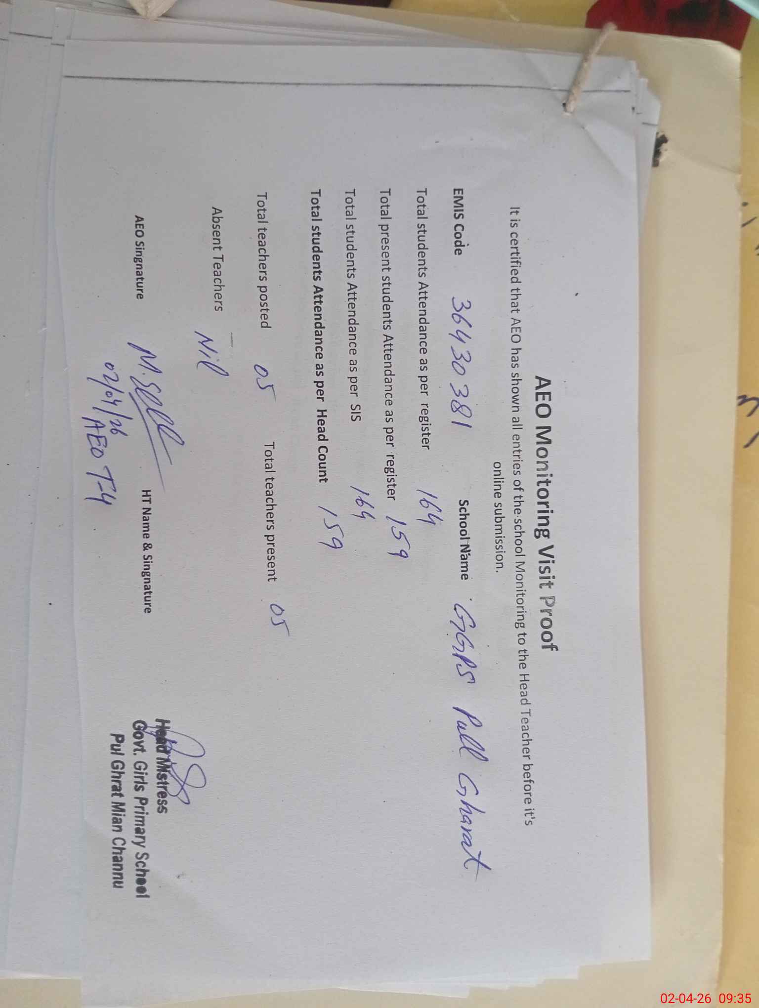 | Attendance Register | Head Teacher | MEA with School | Visit Proof |
