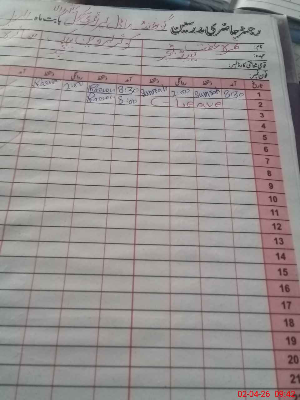| CNIC | Full Name | Designation | R/C | Absence During Last Calender Month |