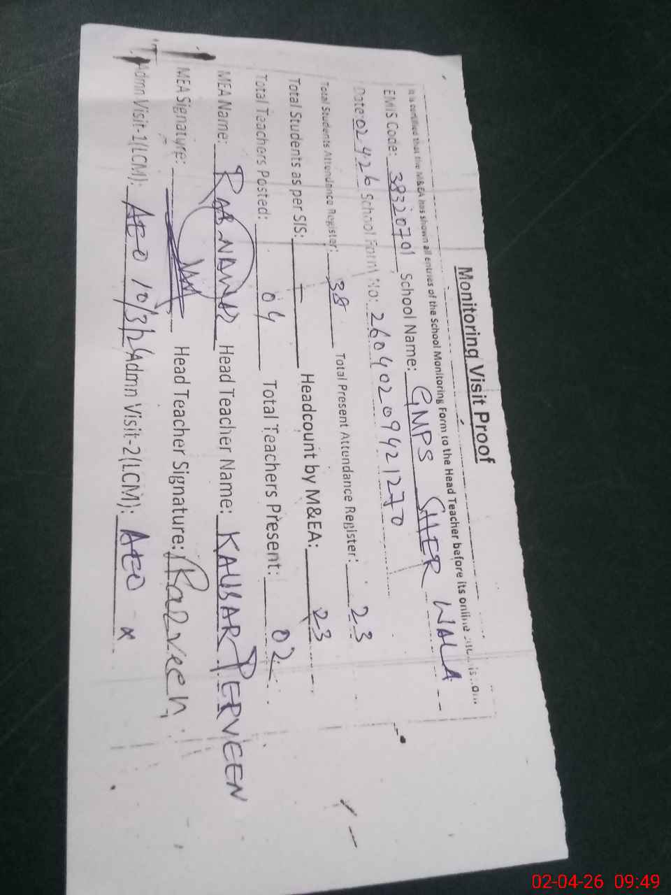 | Attendance Register | Head Teacher | MEA with School | Visit Proof |