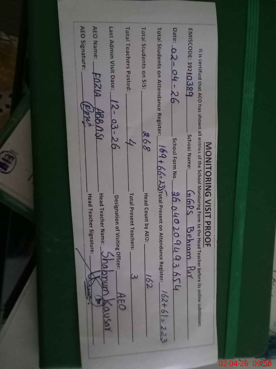 | EMIS Code: 39210389 | Name of School: GGPS BEHRAM PUR | |||