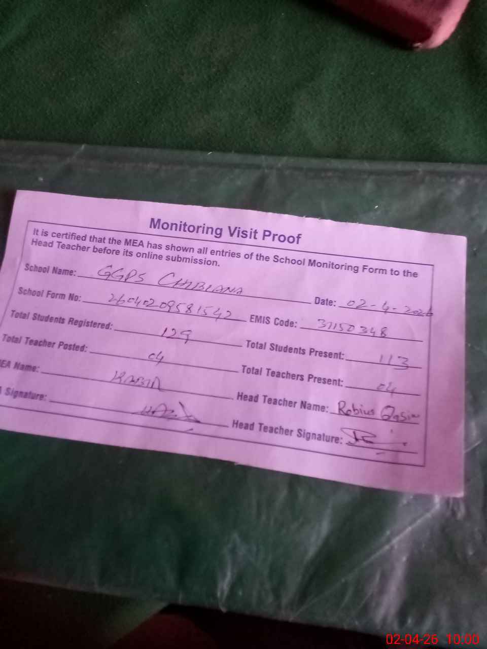 | Attendance Register | Head Teacher | MEA with School | Visit Proof |