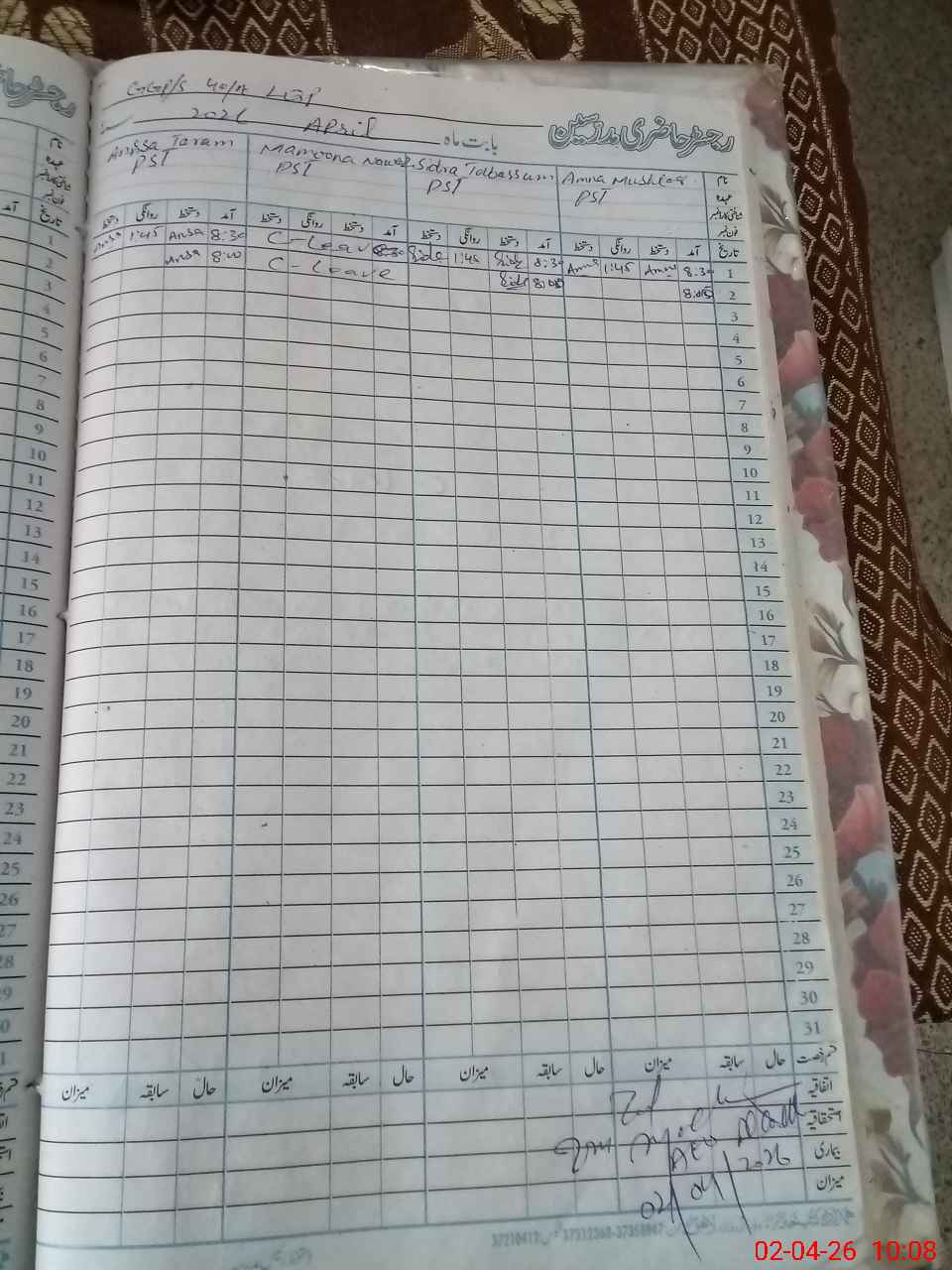 | CNIC | Full Name | Designation | R/C | Absence During Last Calender Month |