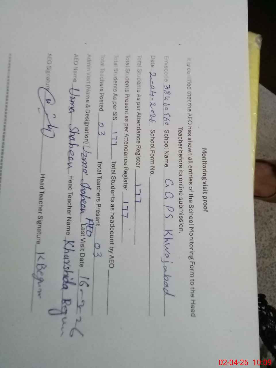 | Attendance Register | Head Teacher | MEA with School | Visit Proof |