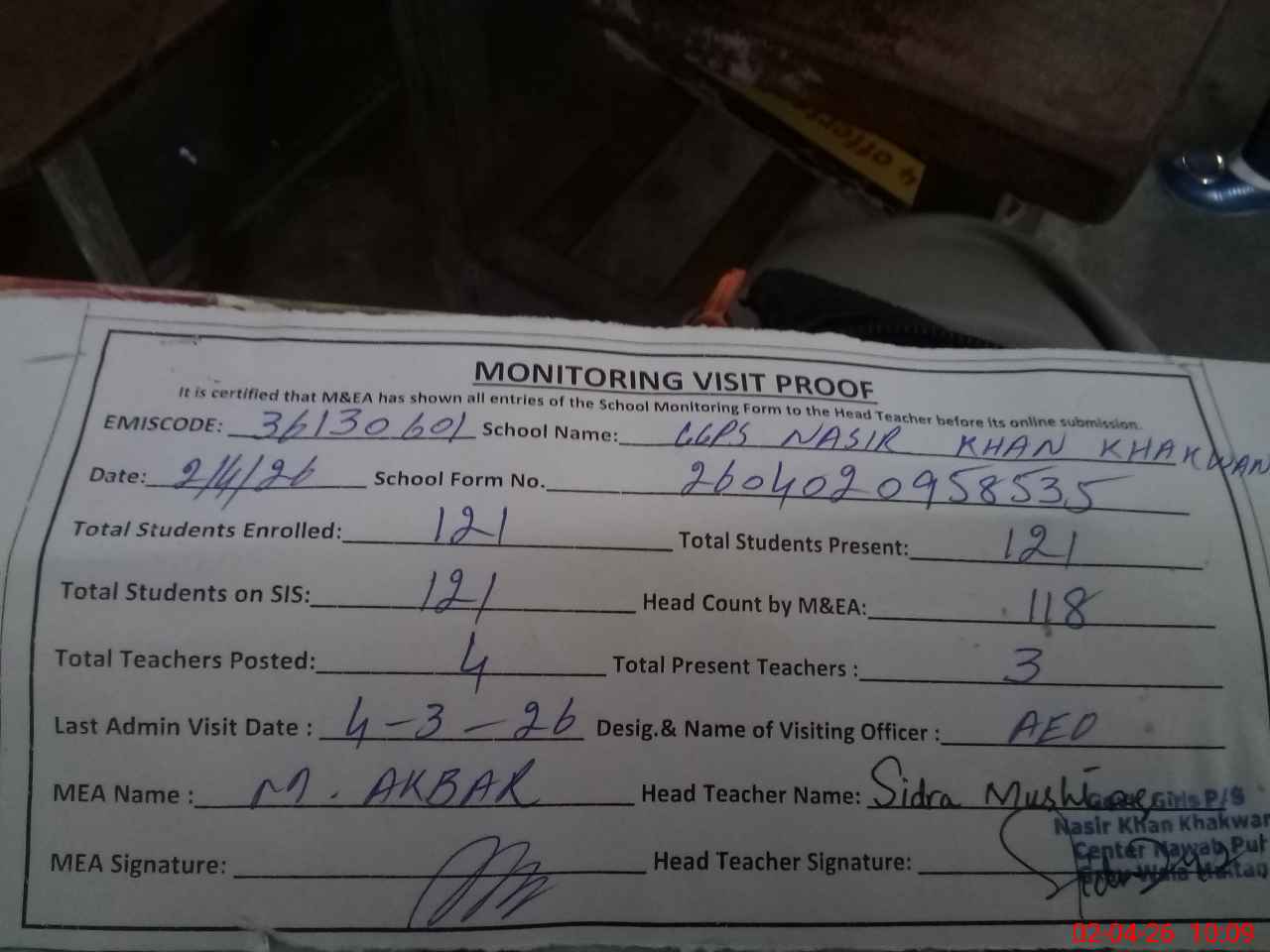 | Attendance Register | Head Teacher | MEA with School | Visit Proof |