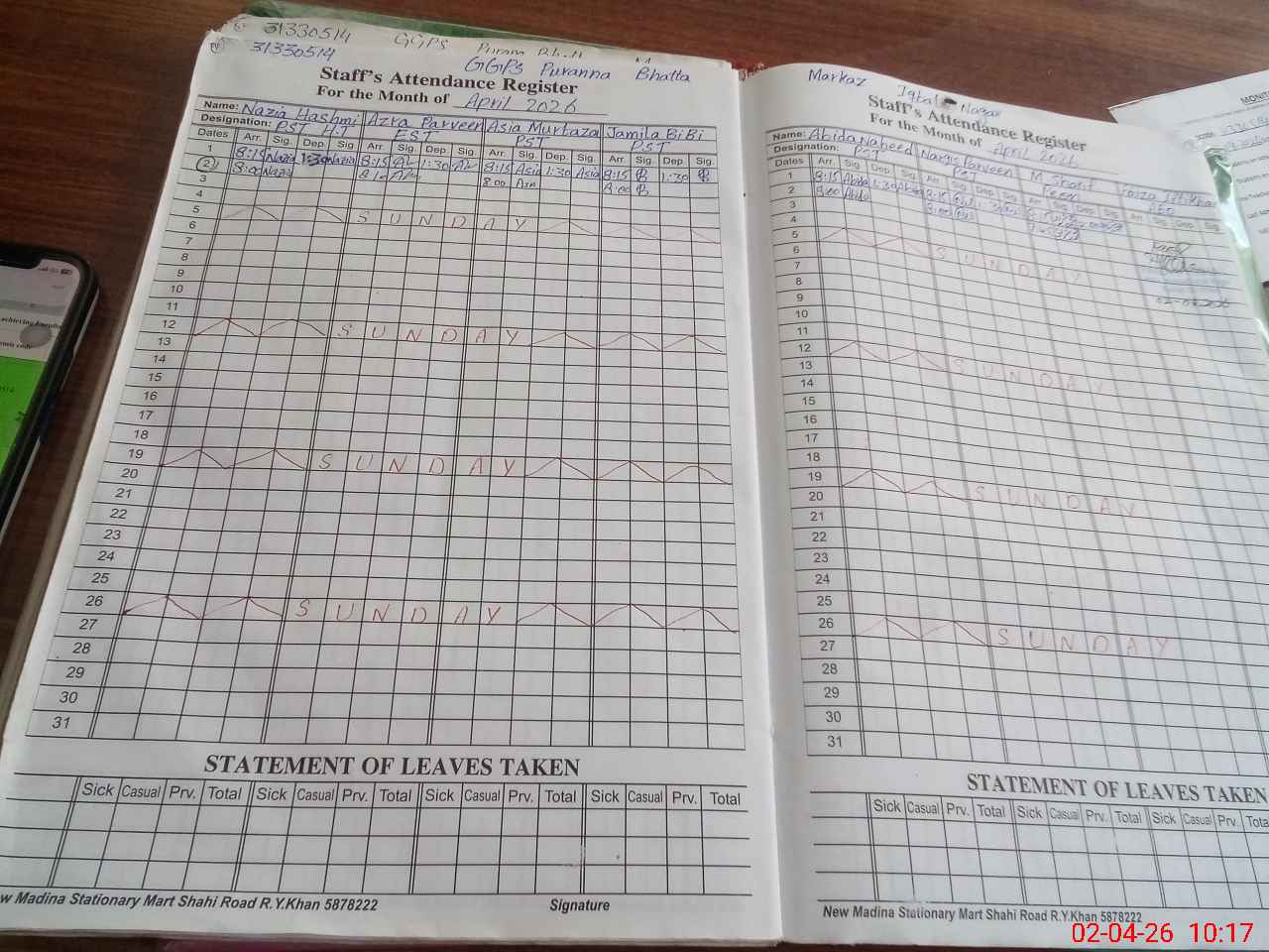 | CNIC | Full Name | Designation | R/C | Absence During Last Calender Month |