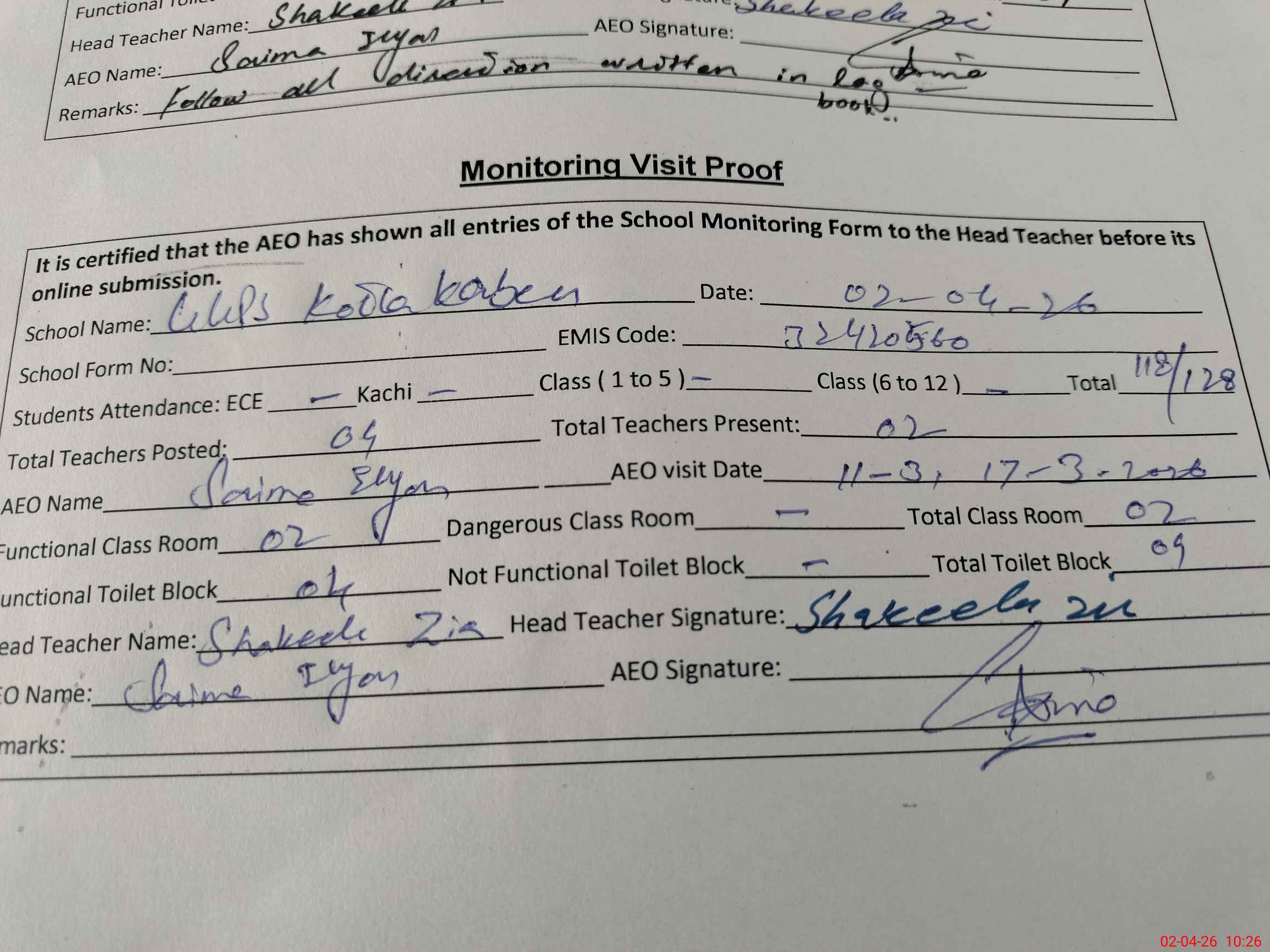 | Attendance Register | Head Teacher | MEA with School | Visit Proof |