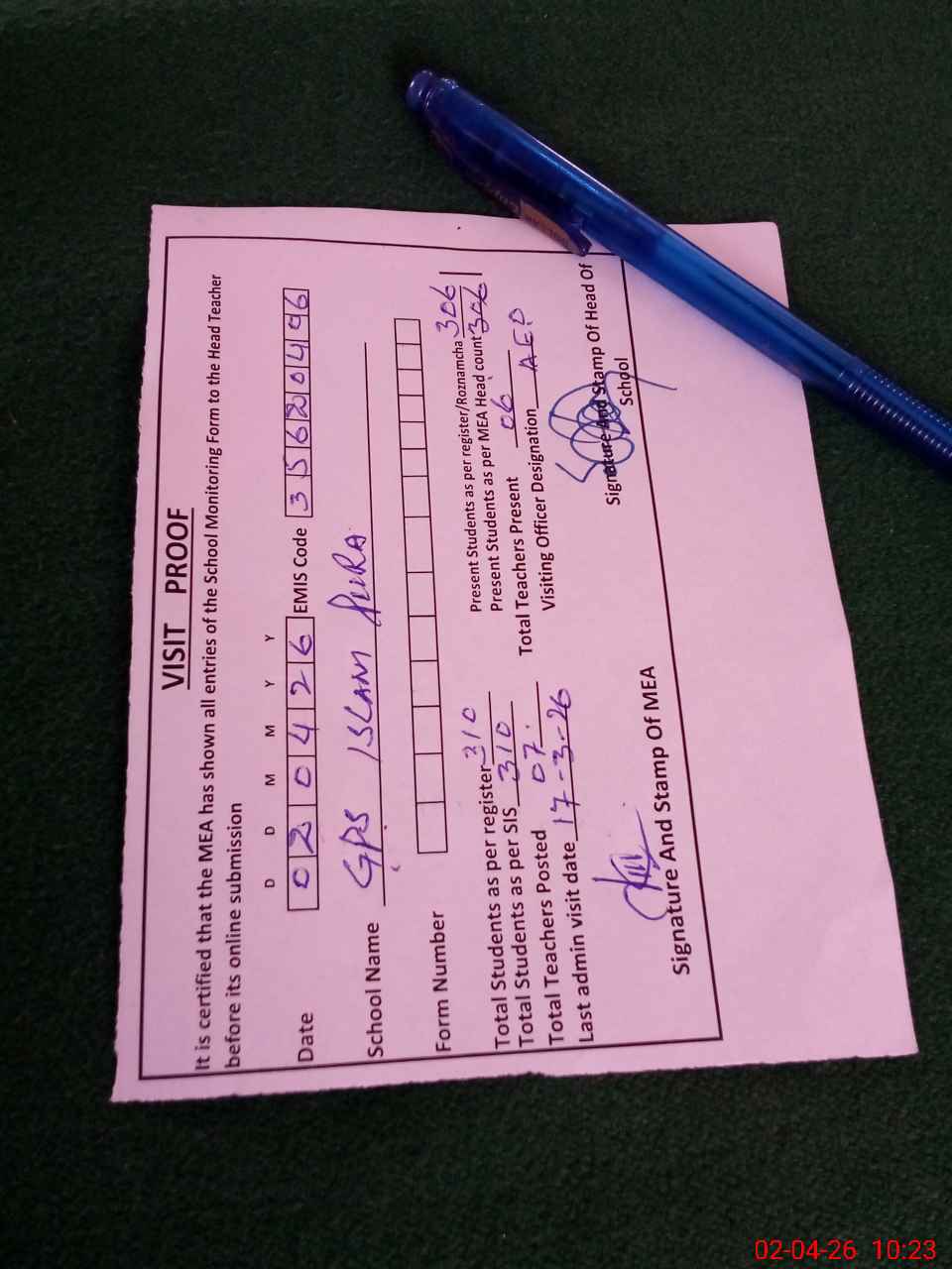| Attendance Register | Head Teacher | MEA with School | Visit Proof |
