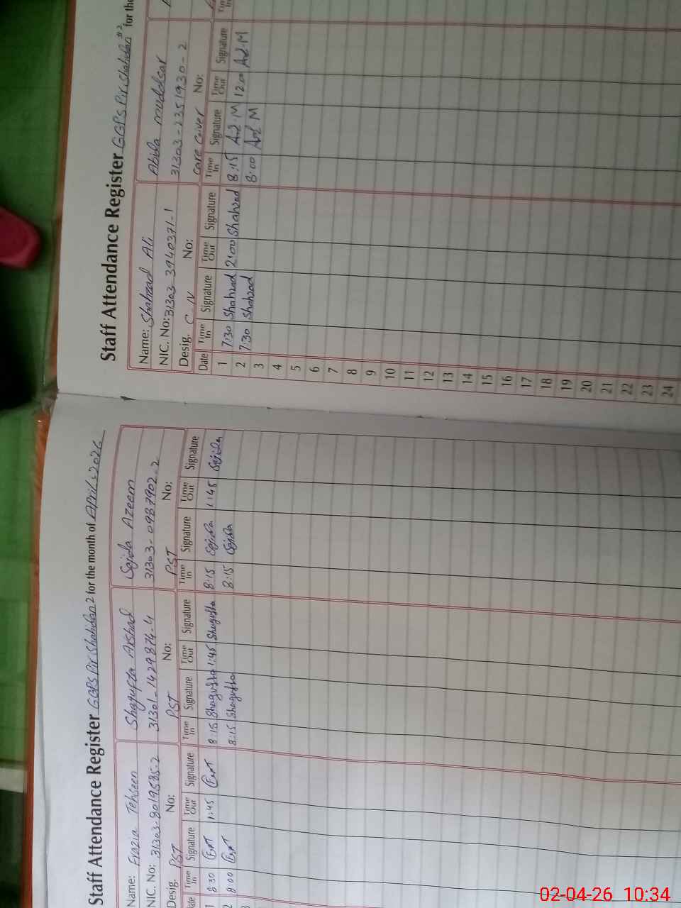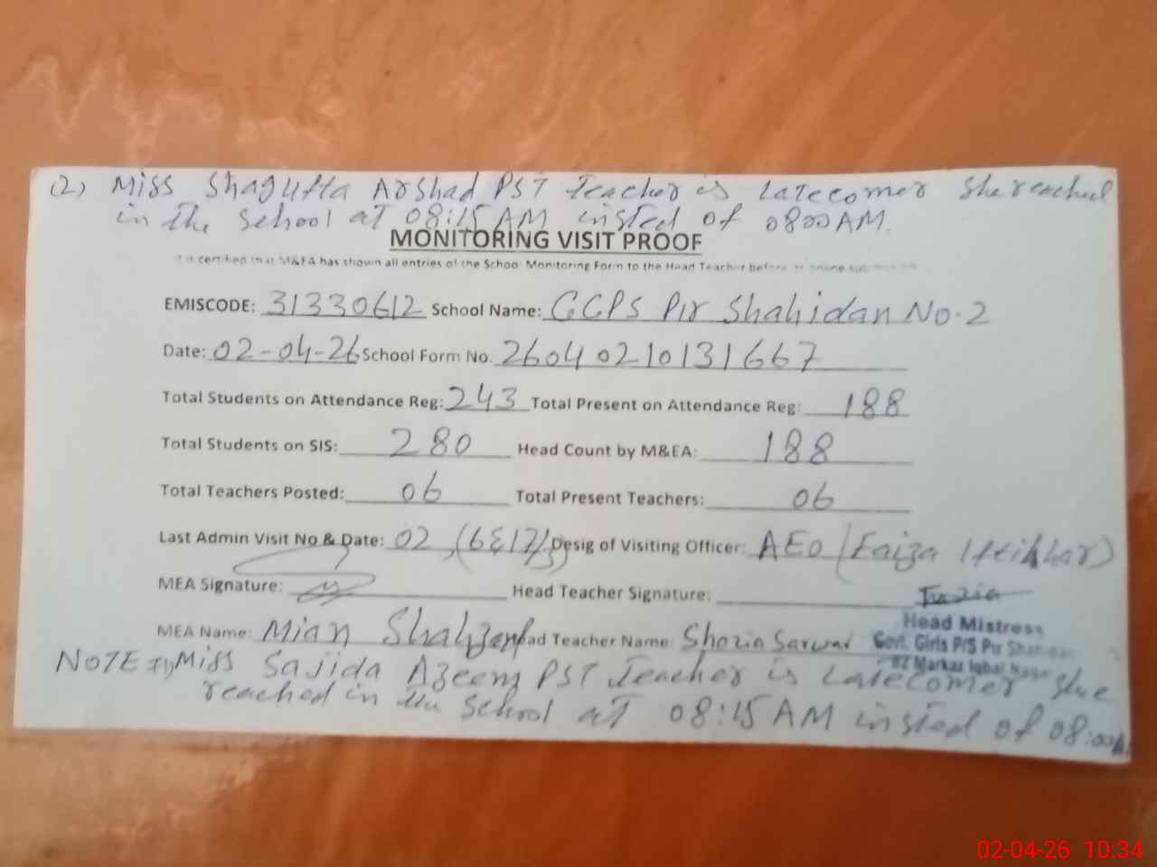 | Remarks (Use Separate Page if Required): 1 Miss Sajida Azeem PST teacher is latecomer she reached in the school at 08:15 AM instead of 08:00 AM. 2 Miss Shagufta Arshad PST teacher is latecomer she reached in the school at 08:15 AM instead of 08:00 AM. | |||||