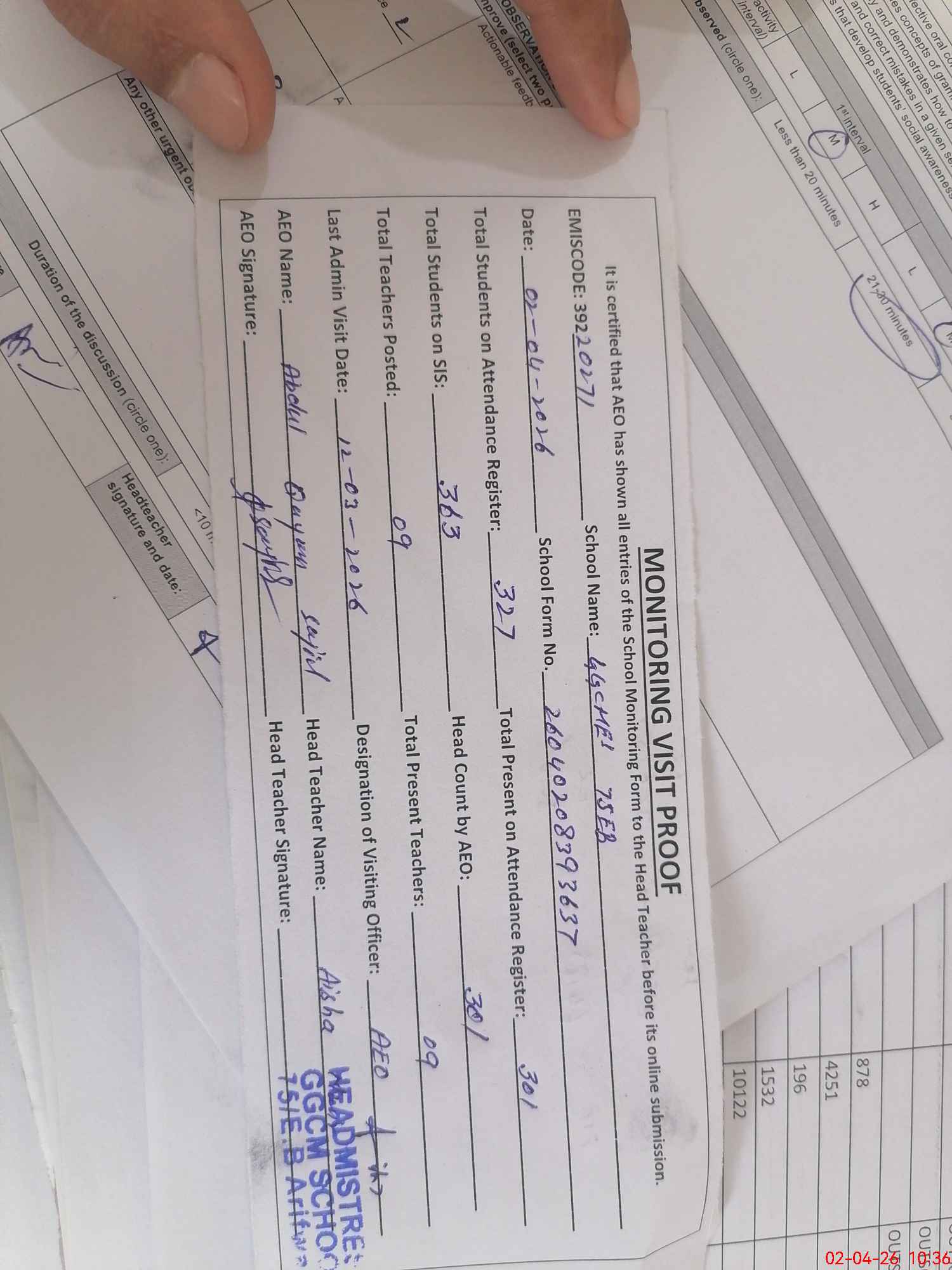 | Attendance Register | Head Teacher | MEA with School | Visit Proof |