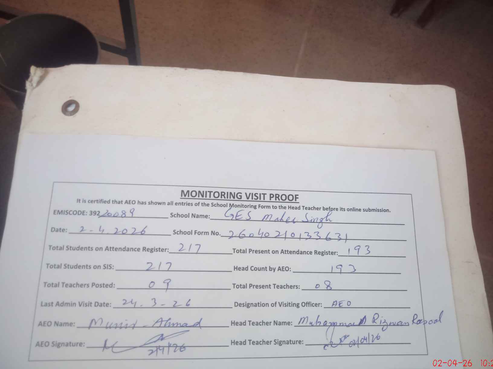 | EMIS Code: 39220089 | Name of School: GES MOHER SINGH ARIFWALA | |||