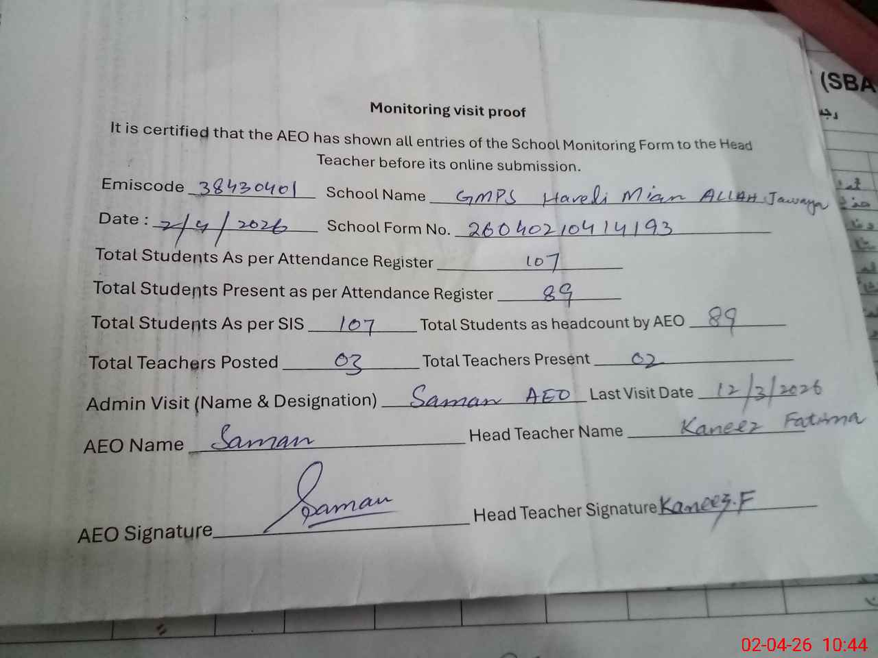 | EMIS Code: 38430401 | Name of School: GMPS HAVELI MIAN ALLAH JAWAYA | |||
