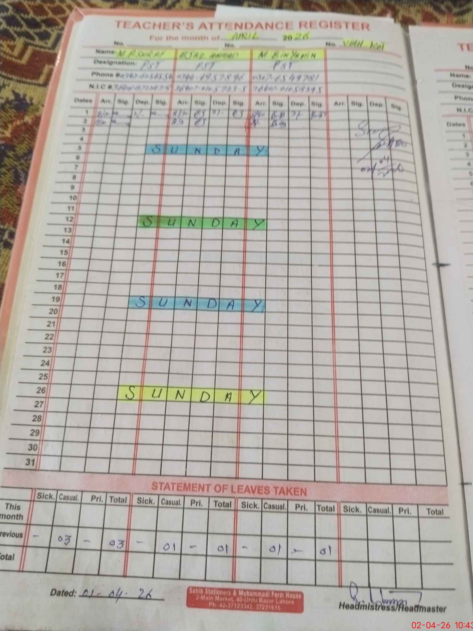 | Name: MU**** AS**** Designation: (School Headmaster's/Headmistress's) PST Phone/Cell Number: 03**** |