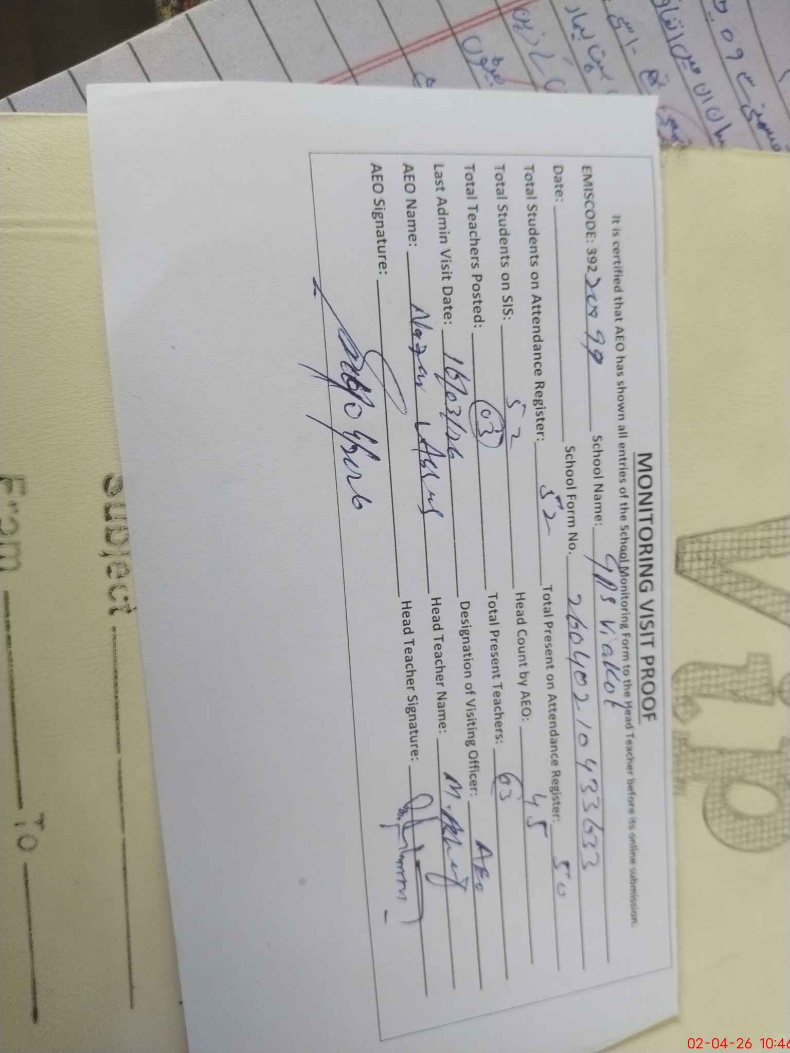 | Attendance Register | Head Teacher | MEA with School | Visit Proof |