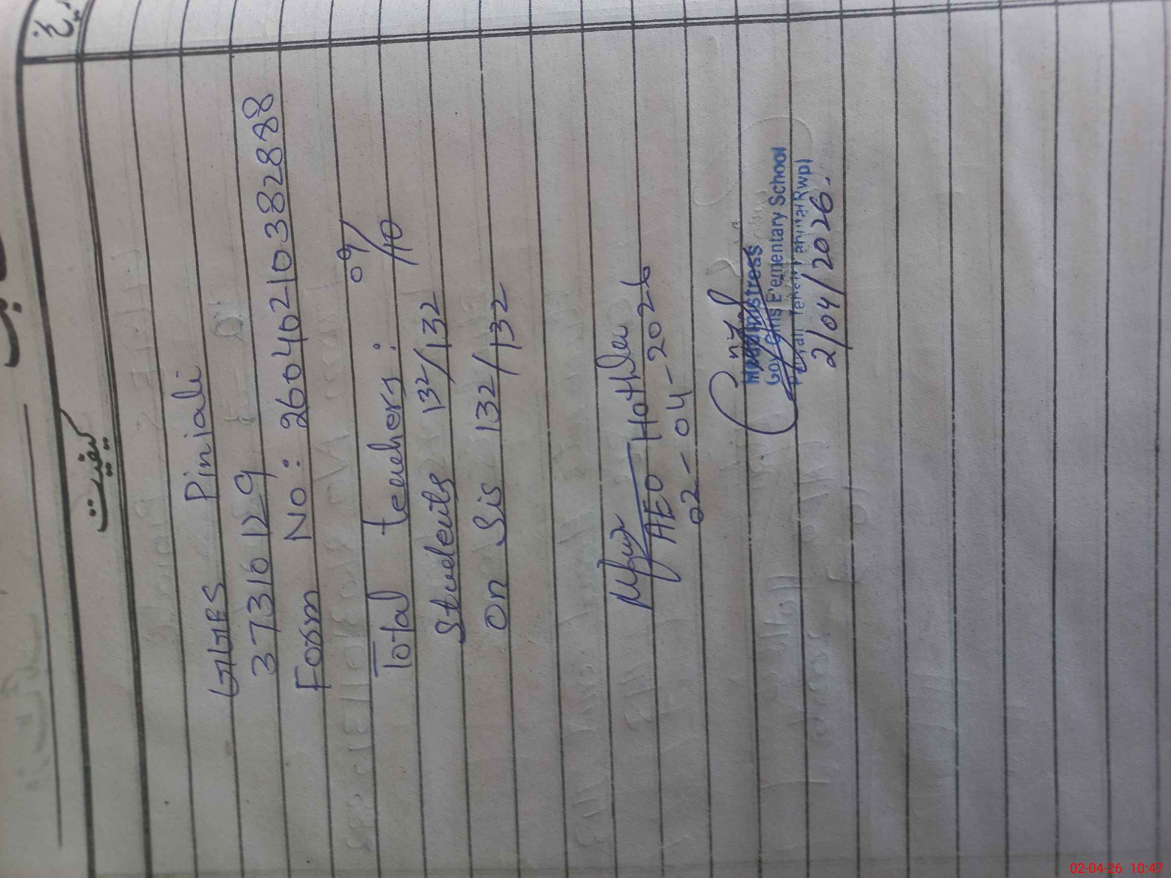 | Certified that this School was Inspected by the Undersigned MEA/DMO Today and the Information Stated Above is as Per Record. | |||||