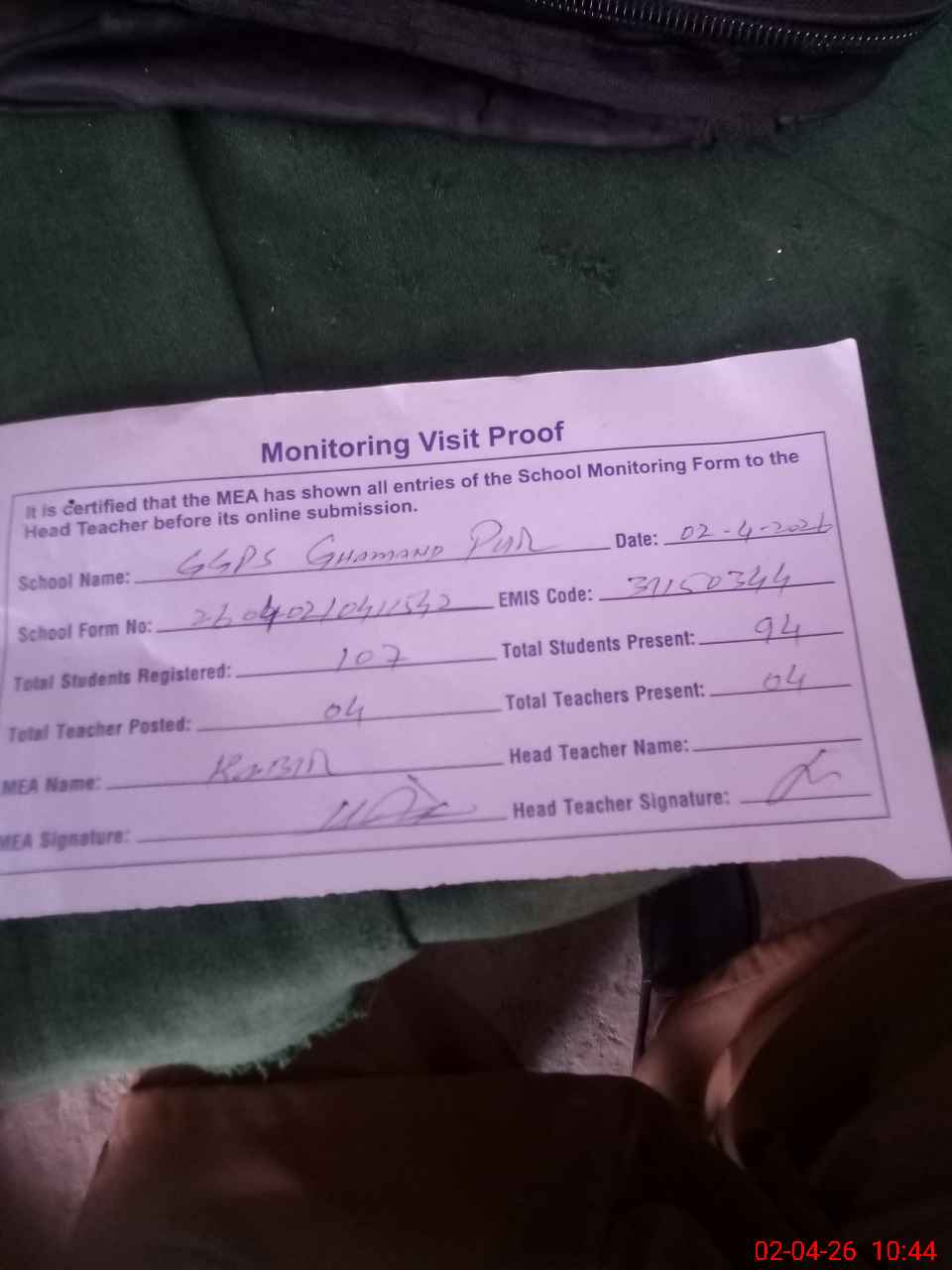 | Attendance Register | Head Teacher | MEA with School | Visit Proof |